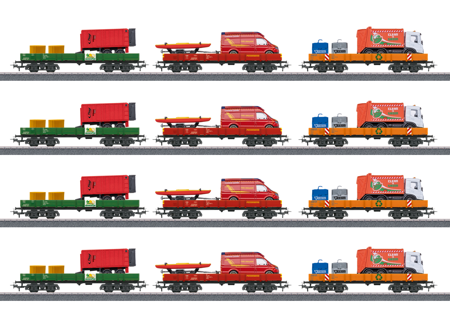 4x Niederbordwagen in landwirtschaftlicher Gestaltung mit Landmaschinen beladen. 4x Niederbordwagen in Feuerwehr-Gestaltung mit Einsatzfahrzeugen beladen. 4x Niederbordwagen in kommunalorangener Farbgebung mit einem Kommunaldienst-Fahrzeug beladen. Alle Wagen im Display einzeln verpackt. Gleichstromradsatz E700580 separat erhältlich.