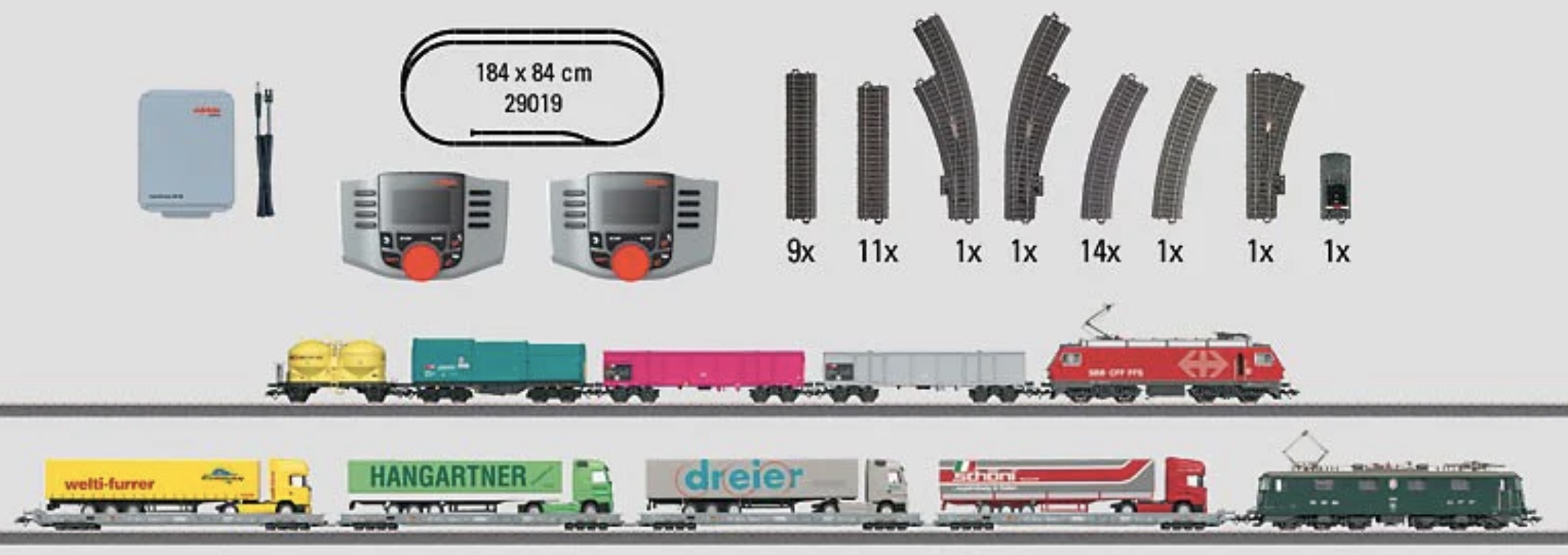 2 Güterzüge der Schweizerischen Bundesbahnen (SBB/CFF/FFS). 1 Elektrolokomotive Serie Ae 6/6 in tannengrüner Farbgebung, 1 Elektrolokomotive Serie Re 4/4 IV in feuerroter Farbgebung, 4 Niederflurwagen mit LKW-Beladung, Privatwagen der Firma HUPAC S.A. für den Transitverkehr der “Rollenden Landstraße”, 2 vierachsige Hochbordwagen, 1 Teleskophaubenwagen und 1 Staubsilowagen.