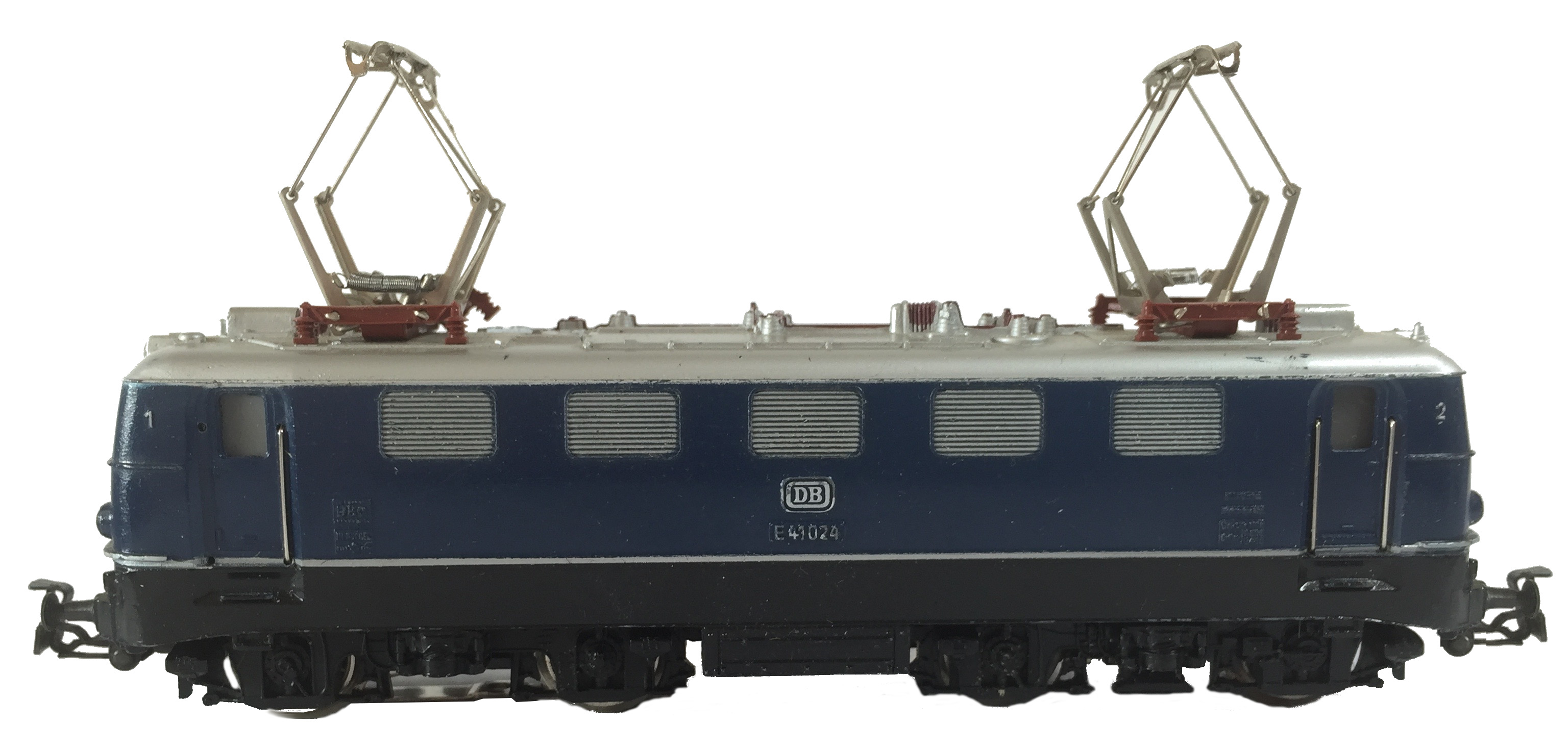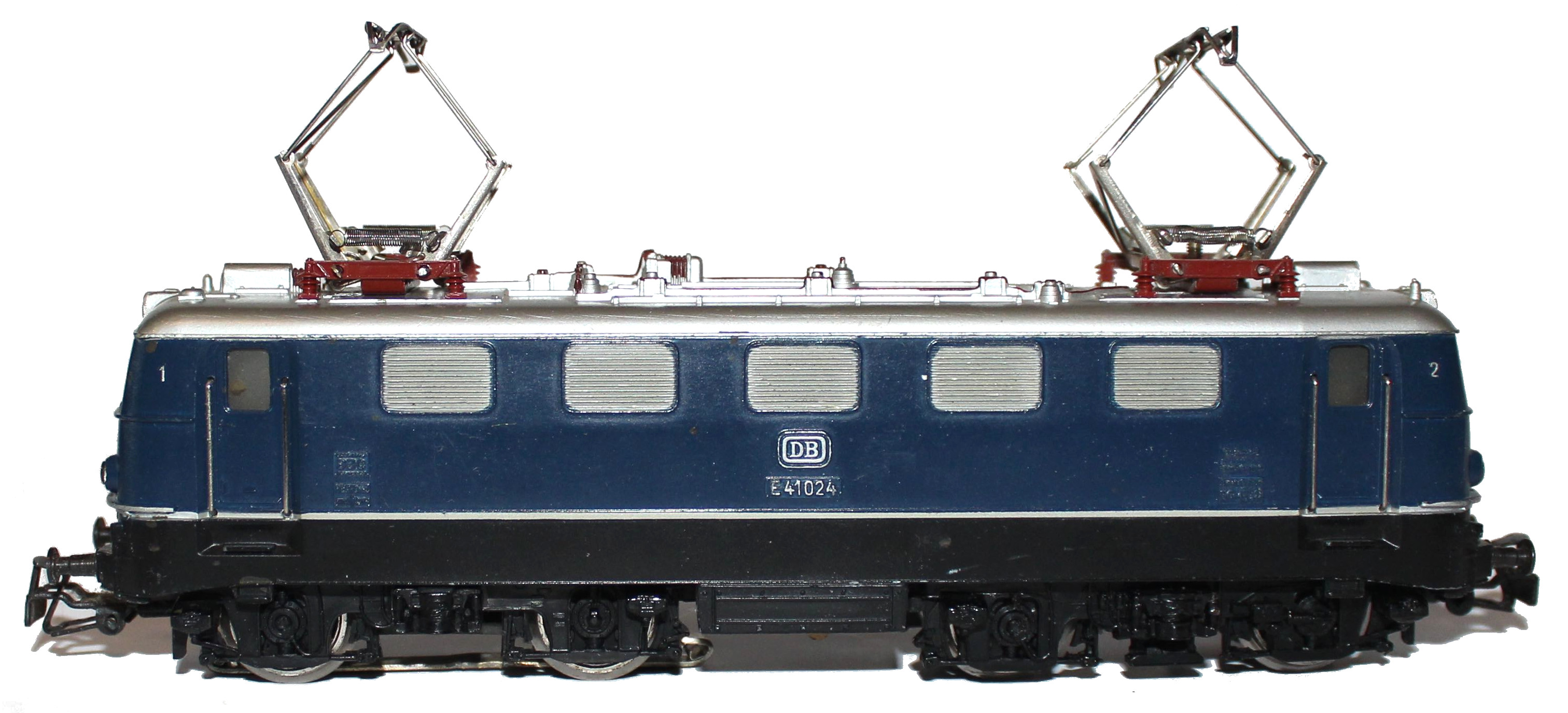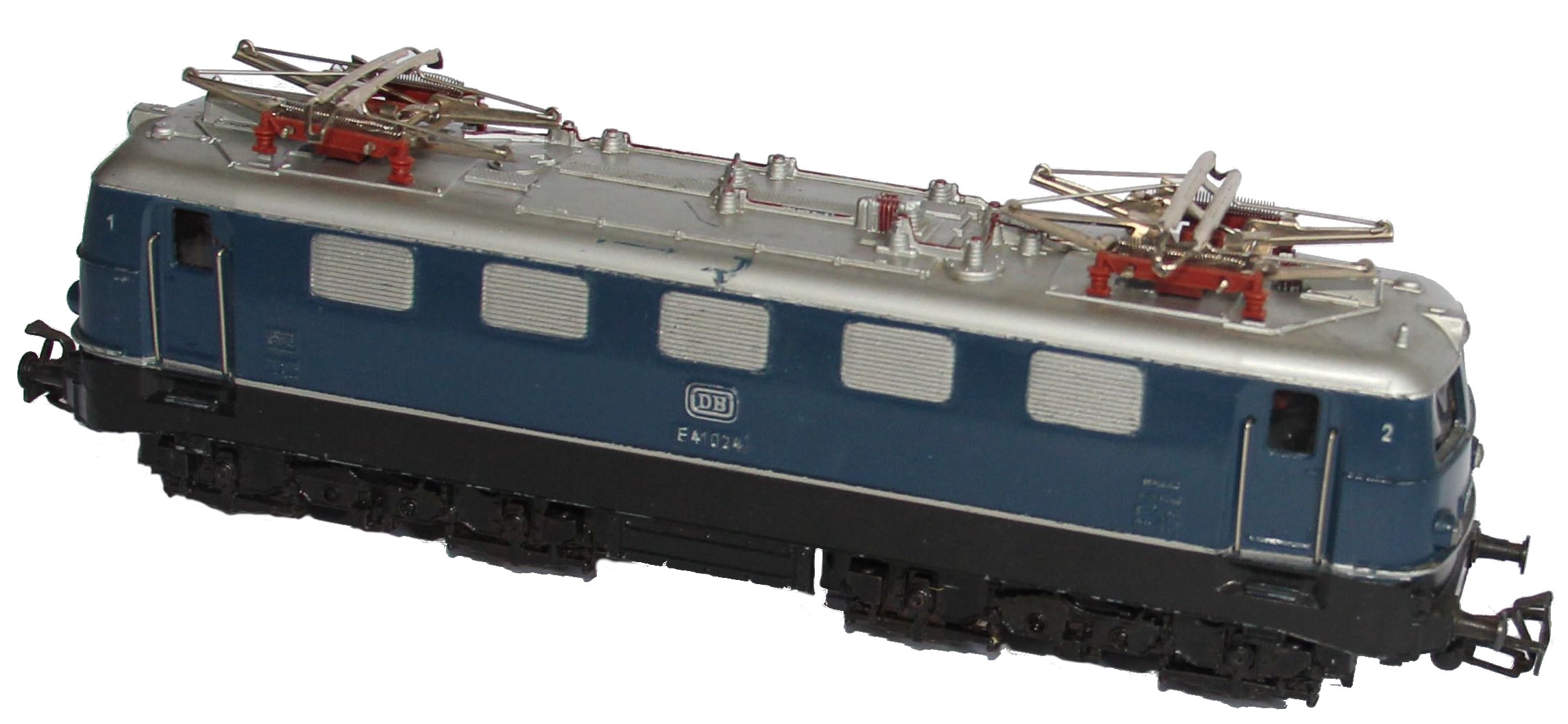 Modell der Baureihe E41 / 141 der DB, Aufbau Zinkdruckguss königsblau halbmatt, Fahrgestell brüniertes Blech, Drehgestellblenden Kunststoff schwarz, Schürze schwarz lackiert, ein Zierstreifen und Aufschriften erhaben, silberfarbig hervorgehoben, Betriebsnummer E 41024, Dach silberfarbig mit rot lackierten, angegossenen Dachleitungen, zweimal drei Stirnlampen (Lichtleiter), Fenster mit Cellon hinterlegt, Umschalthebel für Oberleitung oder Mittelleiter, Achsfolge Bo’Bo’, ein Drehgestell angetrieben mit Haftreifen, Motor mit Flachkollektor, Radkörper Speichenräder vernickelt, nicht lackiert, Schleifschuh Typ 6.4.1 oder Schleifschuh Typ 6.7.1, Kupplungen Typ 19.1, Pantograph Typ 8.1.