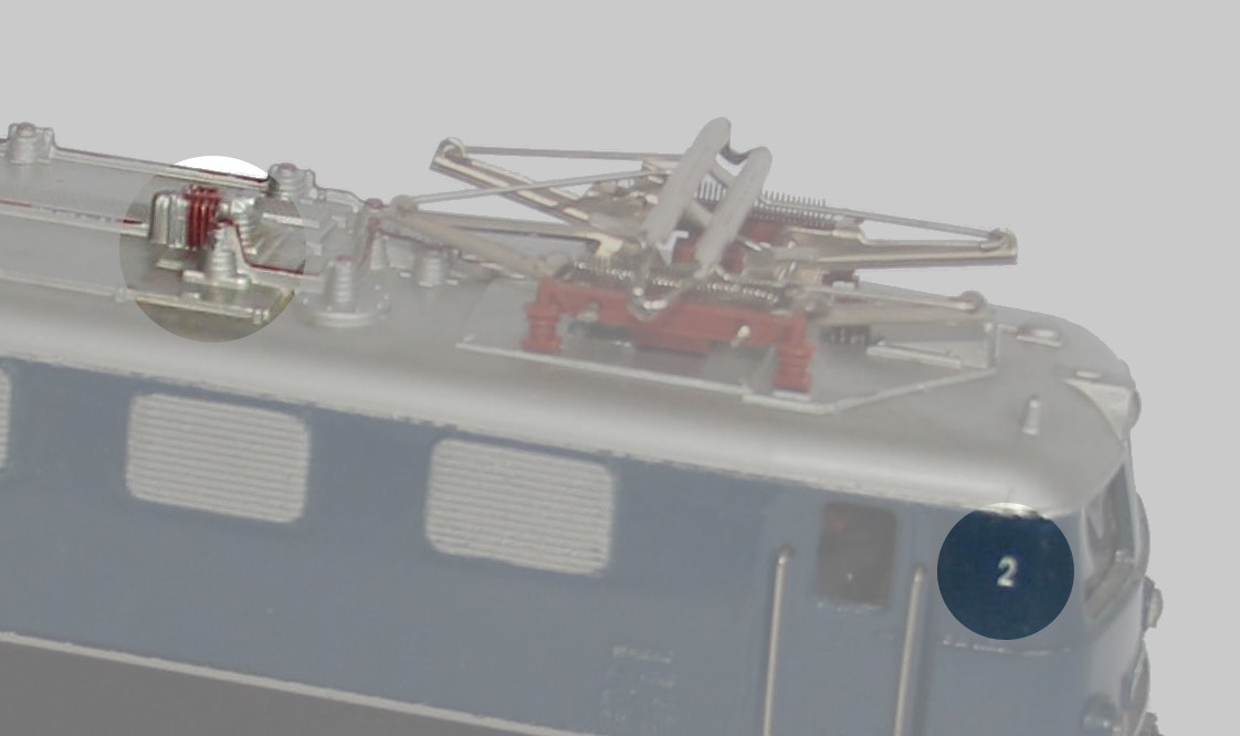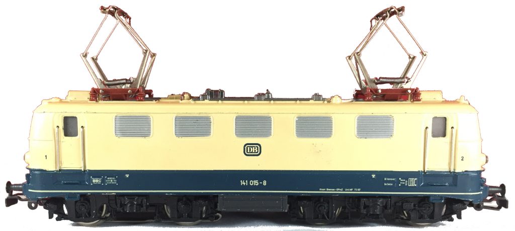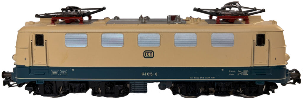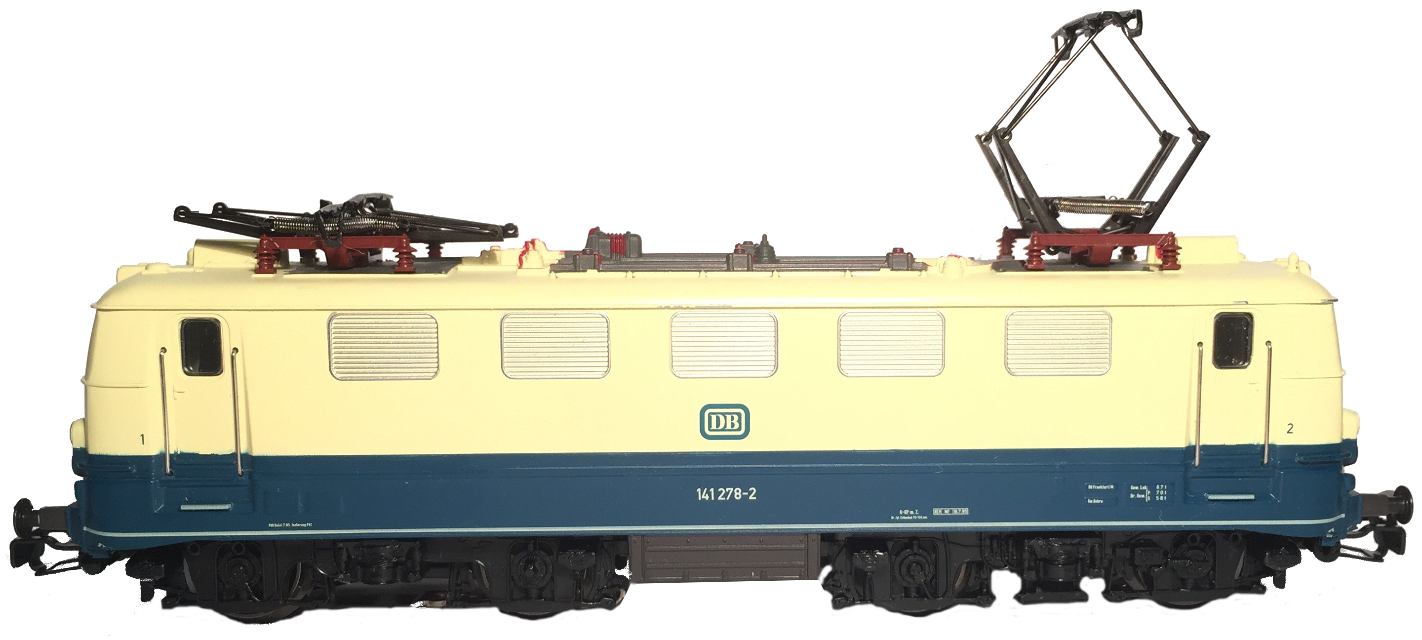 Modell der Baureihe E41 / 141 der DB, Aufbau Zinkdruckguss königsblau halbmatt, Fahrgestell brüniertes Blech, Drehgestellblenden Kunststoff schwarz, Schürze schwarz lackiert, ein Zierstreifen und Aufschriften erhaben, silberfarbig hervorgehoben, Betriebsnummer E 41024, Dach silberfarbig mit rot lackierten, angegossenen Dachleitungen, zweimal drei Stirnlampen (Lichtleiter), Fenster mit Cellon hinterlegt, Umschalthebel für Oberleitung oder Mittelleiter, Achsfolge Bo’Bo’, ein Drehgestell angetrieben mit Haftreifen, Motor mit Flachkollektor, Radkörper Speichenräder vernickelt, nicht lackiert, Schleifschuh Typ 6.4.1 oder Schleifschuh Typ 6.7.1, Kupplungen Typ 19.1, Pantograph Typ 8.1.