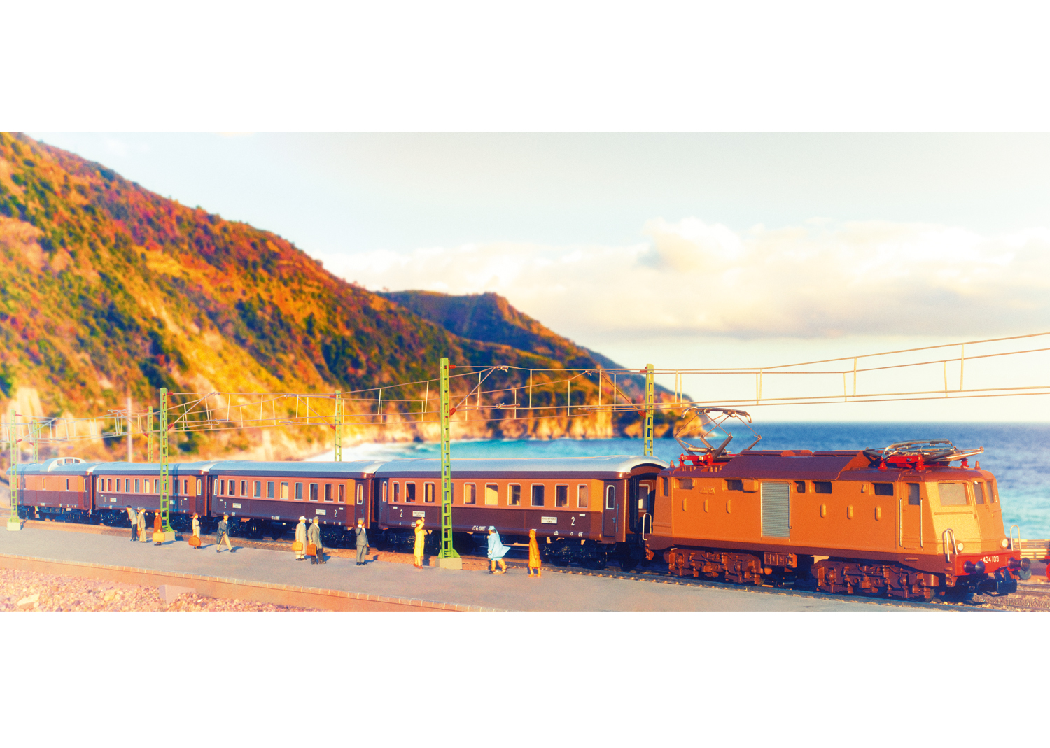 Vorbild: Elektrolokomotive Baureihe E 424 der Italienischen Staatsbahnen (FS). Farbgebung Castano/Isabella. Mit Scheren-Stromabnehmern. Lok-Betriebsnummer E 424.109. Betriebszustand der Epoche III.