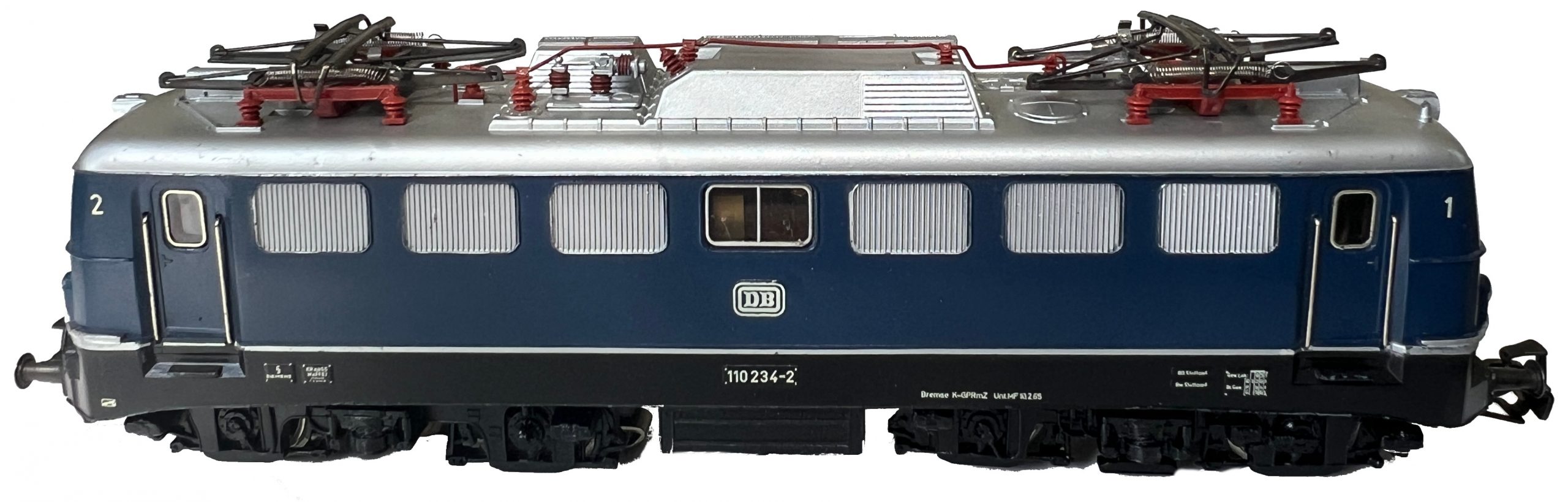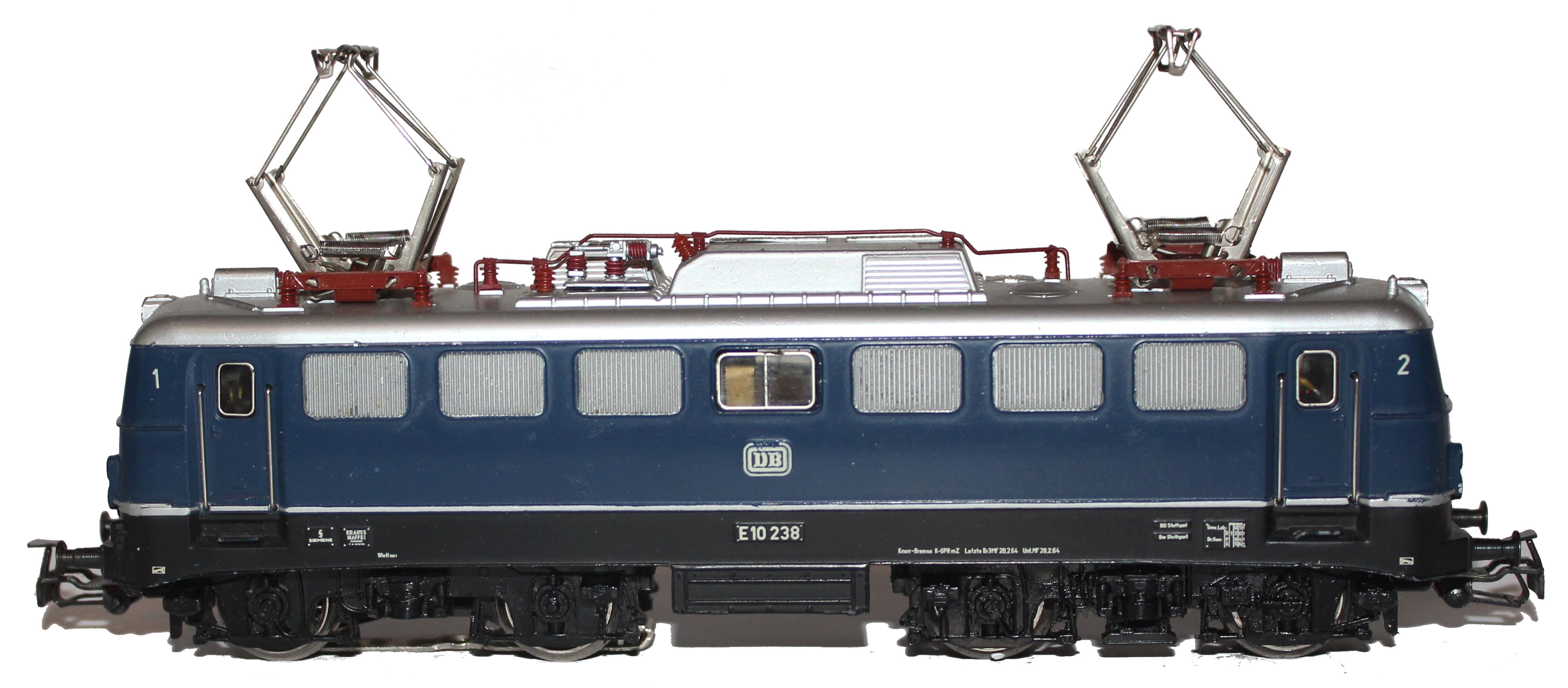 Modell der Baureihe E 10/110 der DB, Dach silberfarbig mit aufgesetzten rotbraunen Dachleitungen, Aufbau königsblau halbmatt mit schablonierten silberfarbigen Lüfterblenden, Brückenrahmen schwarz lackiert mit einem erhabenen, silberfarbigen Zierstreifen, Aufbau gesamt Zinkdruckguss, Fahrgestell brüniertes Blech, Drehgestellblenden Kunststoff schwarz durchgefärbt, Achsfolge Bo’Bo’, Motor mit Flachkollektor, Achsen des hinteren Drehgestells durch Stirnräder angetrieben, beide Radsätze mit Haftreifen, vorderes Drehgestell ohne eigenen Antrieb, Radkörper Speichenräder vernickelt, nicht lackiert, Aufschriften weiß gedruckt, Fenster Kunststoff eingesetzt, seitliche Fenster mit silberfarbigem Rahmen, Beidseitig drei Stirnlampen (Lichtleiter), zwei rote Schlussleuchten angedeutet, Umschalthebel für Oberleitung oder Mittelleiter, Aufschriften Betriebsnummer E 10 238, Schleifschuh Typ 6.4.1 oder Schleifschuh Typ 6.7.1, Kupplungen Typ 19.1, Pantograph Typ 8.1.