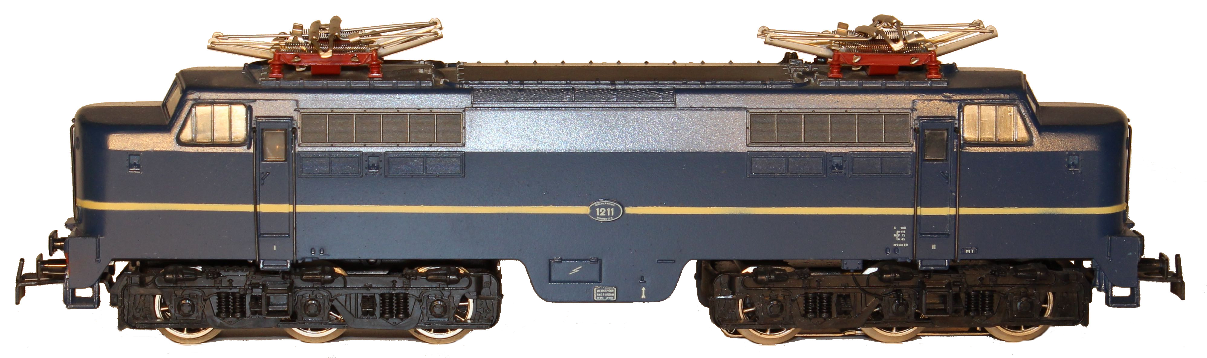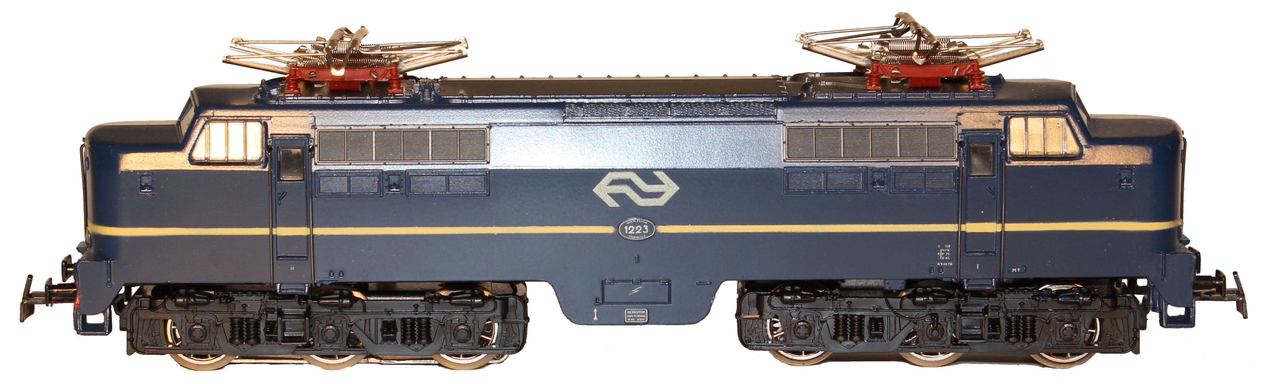 Modell der Serie 1200 der NS, Aufbau Zinkdruckguss, königsblau halbmatt lackiert mit einem schablonierten Zierstreifen, Pufferbohlen rot lackiert mit drei imitierten angegossenen Luftschläuchen, Lüfter senkrecht unterteilt, Fahrgestell brüniertes Blech mit Luftbehältern aus Zinkdruckguss, Drehgestellblenden Kunststoff schwarz durchgefärbt, vier Stirnlampen beidseitig, davon drei asymmetrisch beleuchtet, rechte obere nicht beleuchtet, Dach mit dunkelsilbergrau lackiertem Segment, Dachleitungen angegossen, Aufschriften weiß gedruckt, Betriebsnummern 1219 seitlich und Depot (MT) auf elliptischen erhabenen Schildern, Umschalthebel für Oberleitung oder Mittelleiter, Achsfolge Co’ Co’, Achsen des hinteren Drehgestells durch Stirnräder angetrieben, A- und C-Radsatz mit Haftreifen, Speichenräder vernickelt, nicht lackiert, Schleifschuh Typ 6.4.1 oder Schleifschuh Typ 6.7.1, Kupplungen Typ 16.2, zwei Pantograph Typ 8.1.