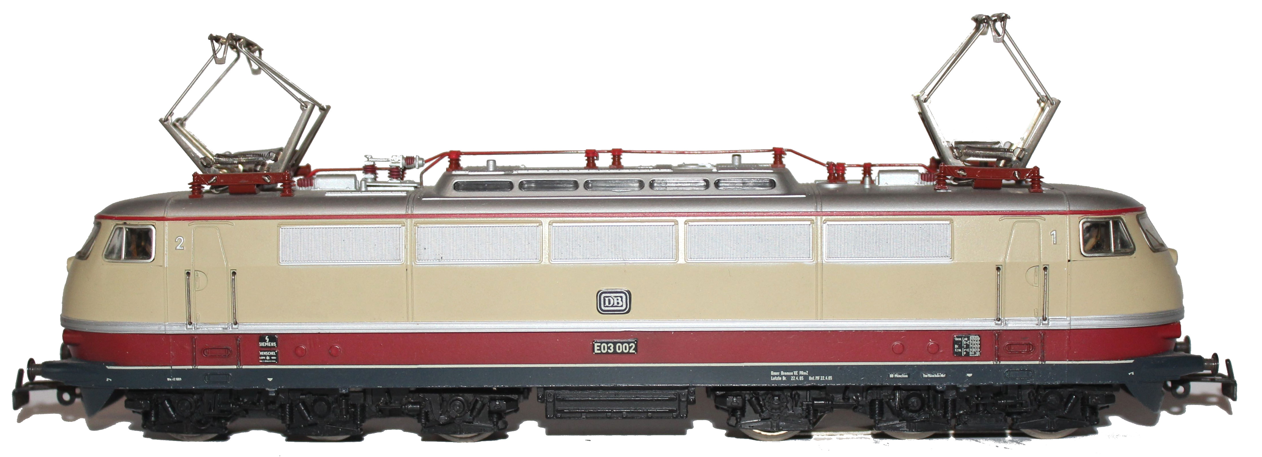 Modell der BR E 03 / 103 der DB, Brückenrahmen Zinkdruckguss karminrot / dunkelgrau lackiert, Aufbau Kunststoff, elfenbeinbeige lackiert mit erhabenem silberfarbigen Zierstreifen, mit einer Lüfterblenden-Reihe seitlich, Dach silberfarbig mit aufgesetzten rotbraunen Dachleitungen und roten Zierstreifen (schabloniert), Fabrik-, Brems-, BD- und Bw- Schilder sowie DB-Embleme auf erhabenen Schildern, Aufschriften weiß, Embleme silberfarbig gedruckt, Fenster Kunststoff mit silberfarbigen Rahmen, je drei Stirnlampen (Lichtleiter), Umschalthebel für Oberleitung oder Mittelleiter, Achsfolge Co’ Co’, Drehgestellblenden Kunststoff schwarz durchgefärbt, Achsen des hinteren Drehgestells durch Stirnräder angetrieben, A- und C-Radsatz mit Haftreifen, Radkörper Vollräder schwarz lackiert, Schleifschuh Typ 6.4.1, Kupplungen Typ 16.2, Pantograph Typ 8.1.