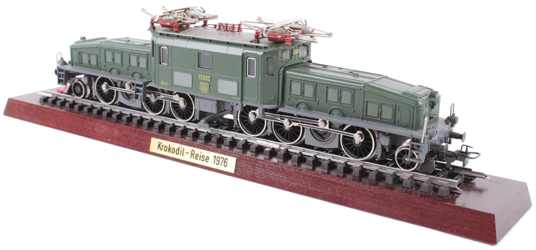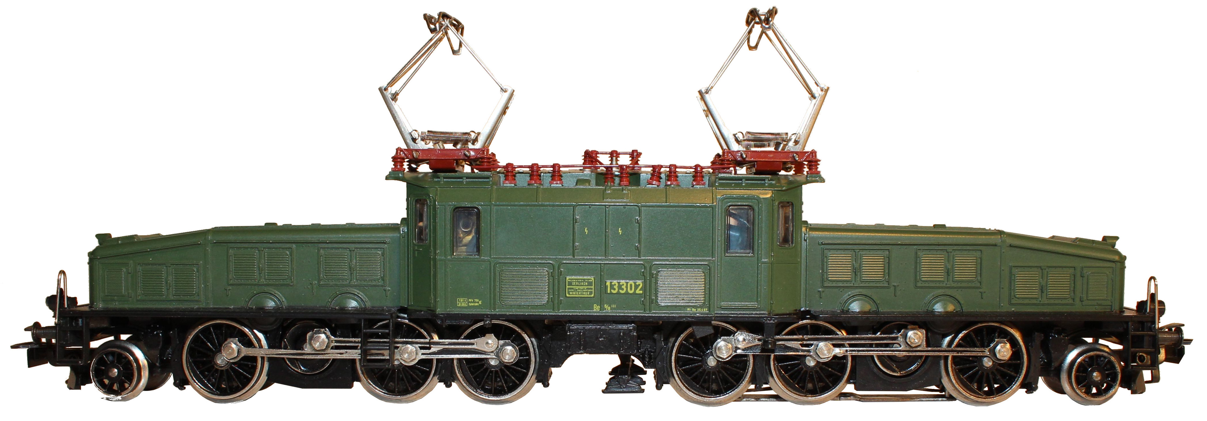 Modell der Serie Be 6/8″ ” der SBB, Aufbauten (Vorbauten und Mittelteil) Kunststoff, mittelgrün, Umläufe schwarz halbmatt lackiert, Fahrgestelle und Brücke Zinkdruckguss, schwarz lackiert, eingesteckte Fahrwerksverkleidungen, aufgesetzte Pufferbohlen und Lenkgestelle Kunststoff schwarz durchgefärbt, Dach mit silbergrau lackierten Segmenten und braunroten aufgesetzten Dachleitungen, Führerstandsfenster seitlich ohne weißen „Aufmerksamkeitsstreifen”, Aufschriften gelb gedruckt, Fabrikschilder und Betriebsnummer 13302 auf erhabenen Schildern, je drei Stirnlampen (Lichtleiter), über mittlerer oberer Lampe eine rote imitierte Schlusslampe, Umschalthebel für Oberleitung oder Mittelleiter, Motor mit Trommelkollektor, Achsfolge (1’C) (C’1), Achsen eines Drehgestells durch Stirnräder angetrieben, A- und C- Radsatz mit Haftreifen, Speichenräder und Radkörper schwarz lackiert, Treib- und Kupplungsstangen (ein Stanzteil) schwarz ausgelegt, Schleifschuh Typ 6.7.1, Kupplungen Typ 8.3, Pantograph Typ 8.2.