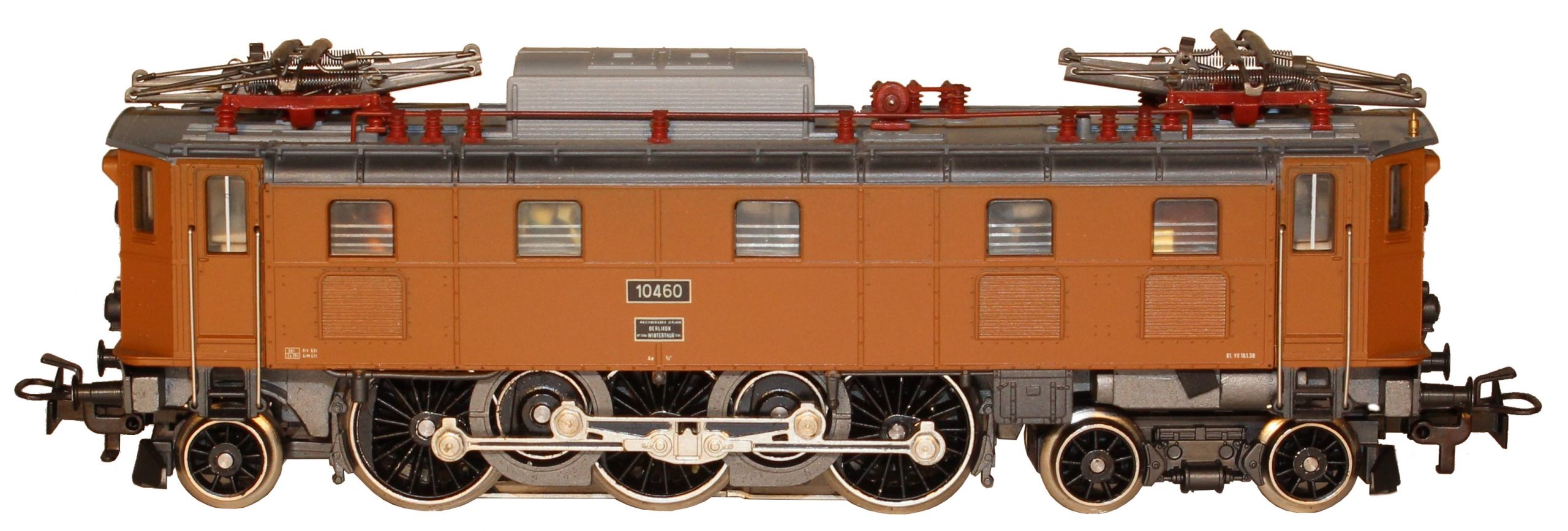 Modell der Serie Ae 3/6 der SBB, Aufbau ein Kunststoffteil, Seitenwände ockerbraun lackiert, Dach hellgrau, seitliche Dachkanten schattiert, aufgesetzte Dachleitungen braunrot lackiert, Stirnwände mit Türen und Übergangssteg, unter der Rahmenlinie dunkel-silbergrau, wie das Fahrgestell aus Zinkdruckguss, lackiert, eingesteckte Bremsattrappen, Vorlaufgestelle und Pufferbohlen Kunststoff dunkelsilbergrau durchgefärbt, Aufschriften beigeweiß, Betriebsnummer 10460 und Fabrikschilder auf schwarzem Grund gedruckt, Fenster Kunststoff einsetzt, beidseitig je drei Stirnlampen (außen schwarz handlackiert, Lichtleiter, Umschalthebel für Oberleitung oder Mittelleiter, Achsfolge 2’C1′, Treibachsen durch Stirnräder angetrieben, C-Radsatz mit Haftreifen, Radkörper, Treib- und Kupplungsstangen (ein Zinkdruckgussteil) sowie Blindwellen schwarz ausgelegt, Schleifschuh Typ 6.8, Kupplung Typ 8.3, Pantograph Typ 8.3.