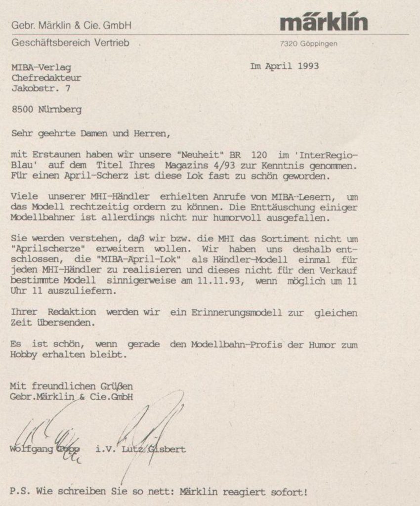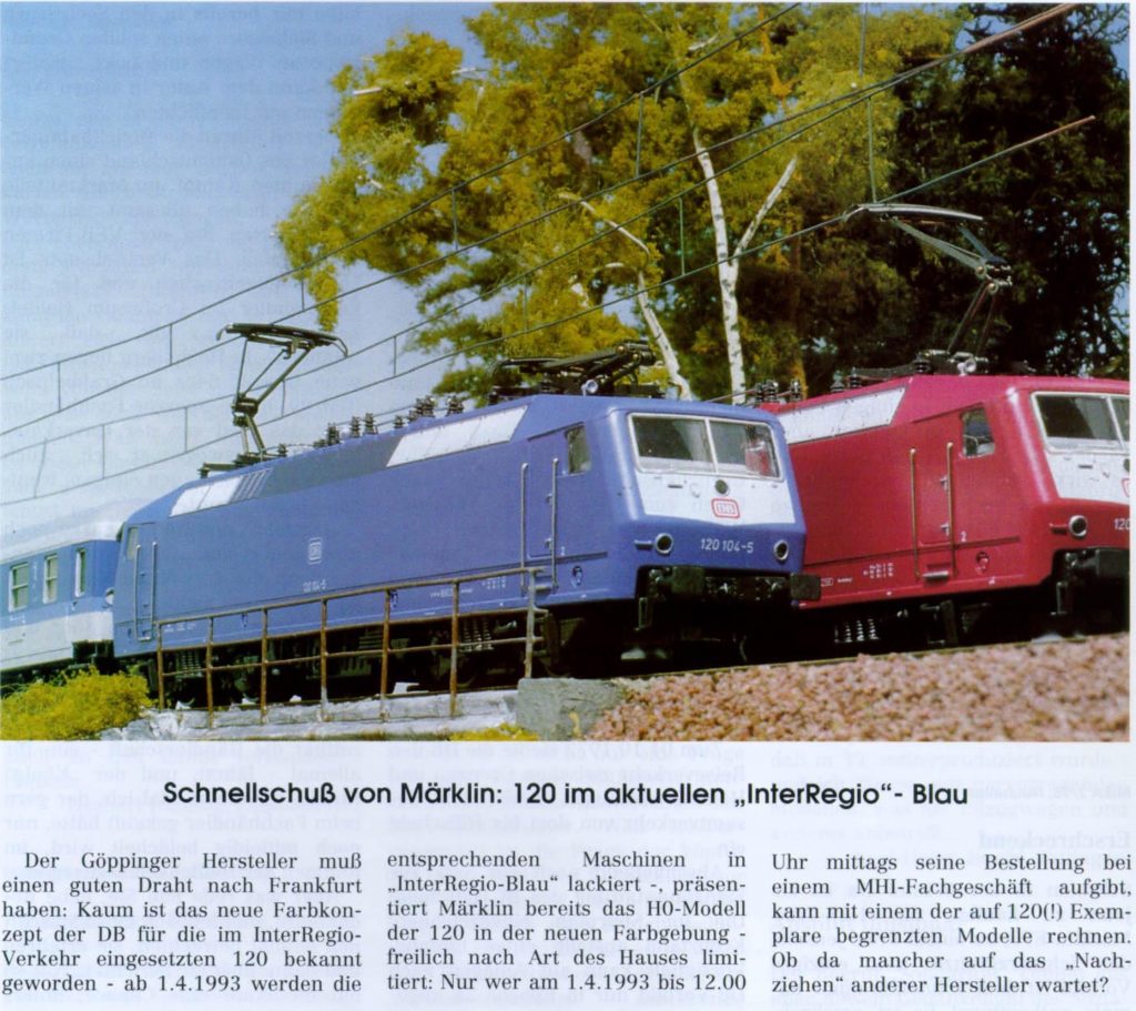 Hinweis: In der Fachzeitschrift MIBA – Miniatur Bahnen vom April 1993 wurde ein April-Scherz veröffentlicht mit dem Titel: “Schnellschuß von Märklin: Die BR 120 im aktuellen InterRegio-Blau .., limitiert auf 120 (!) Stück.”. Die Lokomotive musste demnach bis zum 1.1.1993 mittags 12 Uhr bestellt werden. Dieses löste – natürlich – eine Welle von Bestellungen aus, die dann tatsächlich auch von Märklin im Modell umgesetzt und ausgeliefert wurden. Allerdings produzierte Märklin daraufhin für jede MHI-Mitgliedsfirma ein Exemplar 3173 – hieraus resultiert die tatsächliche Auflage von 1.400 Stück. Die Auslieferung dieser “April-Scherz-Lokomotiven” erfolgte am 11.11.1993.