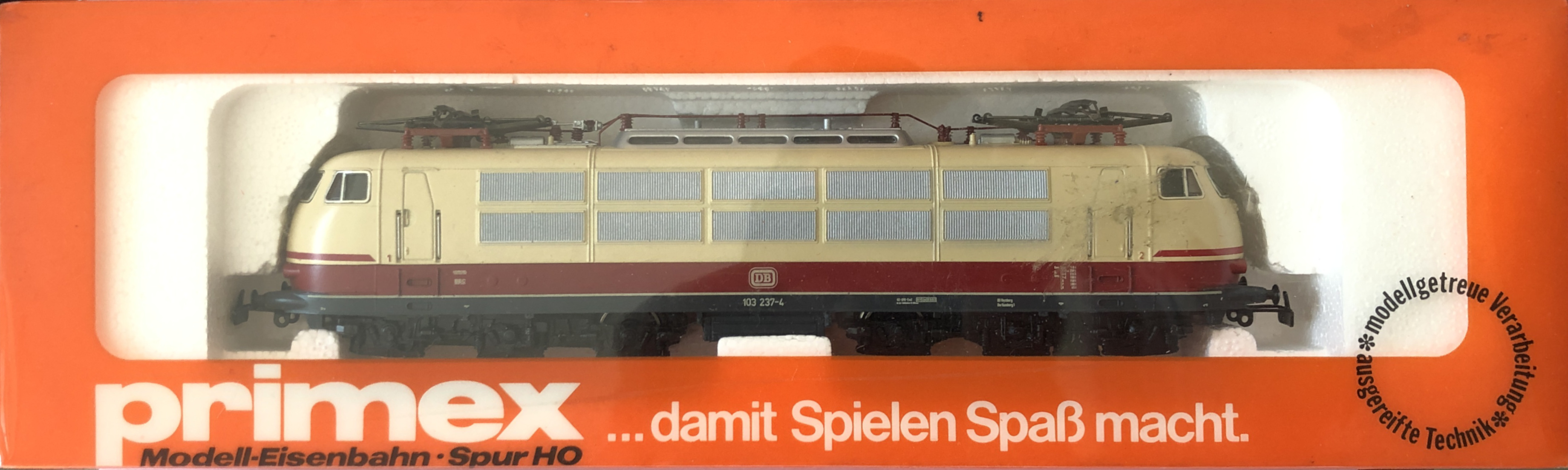 Modell der Baureihe 103 der DB, baugleich mit Märklin 3054, Aufbau Kunststoff rot / beige, Lüftungsgitter und Dachaufbau silberfarbig schabloniert lackiert, zwei Dachstromabnehmer, Isolatoren und Dachleitungen rot, Rahmen (Fahrgestell) Zinkdruckguss grau lackiert, Rahmen ohne Stirnwandbodenschürzen, Stirnwandzierstreifen Schiebebild, Betriebsnummer 103 237-4, Bw Hamburg 1, DB-Logo auf Stirnseiten schwarz auf erhabenem Schild, Aufdrucke weiß bzw. rot, Achsfolge Co’Co’.