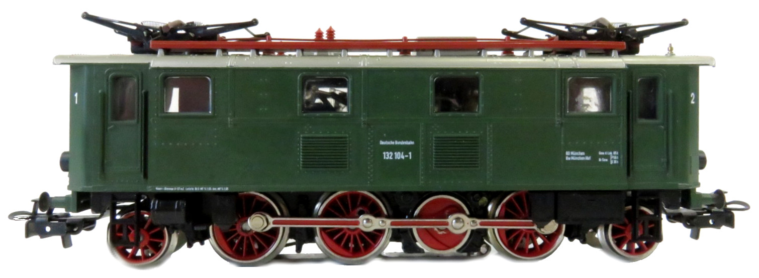 Modell der Baureihe 132 der DB, Aufbau Kunststoff mittelgrün halbmatt, Dach silbergrau lackiert, Holzlaufstege auf dem Dach Kunststoff braun durchgefärbt, extra aufgesetzt, separate Dachleitungen und Isolatoren braunrot, Fahrgestell Zinkdruckguss (von Märklin 3030) schwarz lackiert, auf beiden Seiten Dreilichtspitzensignal (Lichtleitstäbe), alle Aufdrucke weiß, Betriebsnummer 132 104-1, Kunststofffenster eingesetzt, Achsfolge 1’C1′. Radkörper und Kupplungsstangen rot ausgelegt, Treibachsen durch Stirnräder angetrieben, Blindwelle bei Führerstand 2.