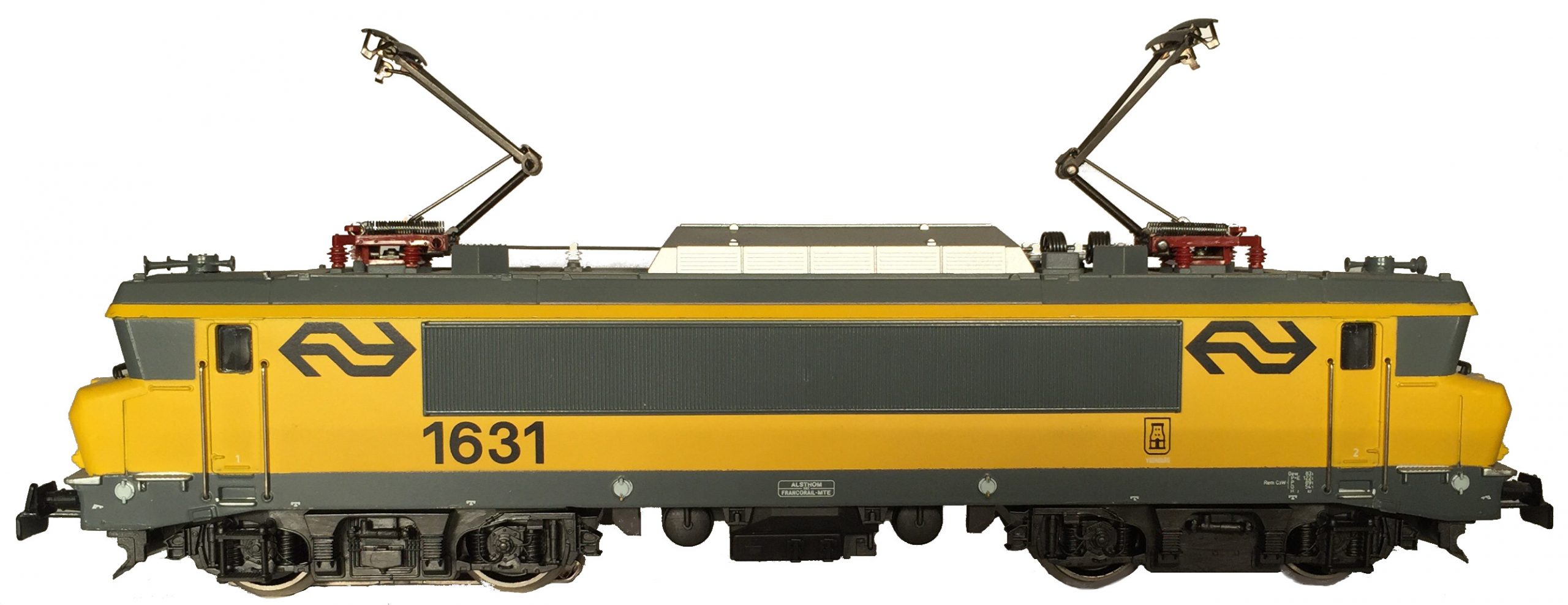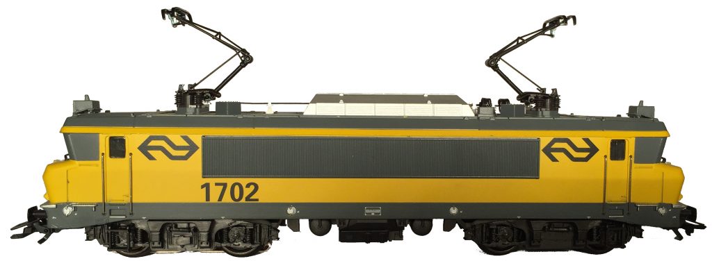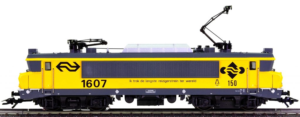 Modell de BR 1600 der NS, baugleich mit Modell 3325, Aufbau gelb, Dach, Stirnfensterpartie, seitliche Lüfterblenden und Brückenrahmen basaltgrau, teilweise schabloniert, eingesetzter Dachaufbau silberfarbig lackiert, geänderte Unterflurattrappe, Drehgestellblenden Kunststoff dunkel grau durchgefärbt, ohne Räumpflug, beidseitig je drei Stirnlampen und zwei imitierte Schlussleuchten, NS-Logo, Städtewappen von Vooiburg schwarz, übrige Aufschriften weiß gedruckt, Achsfolge B’B’ (monomoteur), mit „schnellem Getriebe”, Achsen des hinteren Drehgestelles durch Stirnräder angetrieben, Räder mit Haftreifen, vorderes Drehgestell (Blech brüniert) ohne eigenen Antrieb, Vollräder vernickelt, Radkörper schwarz lackiert, Schleifschuh Typ 6.7.1, Kupplung Typ 16.2, Pantograph Typ 9.2.
