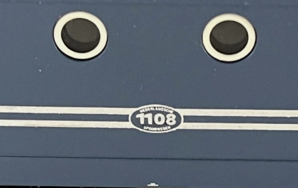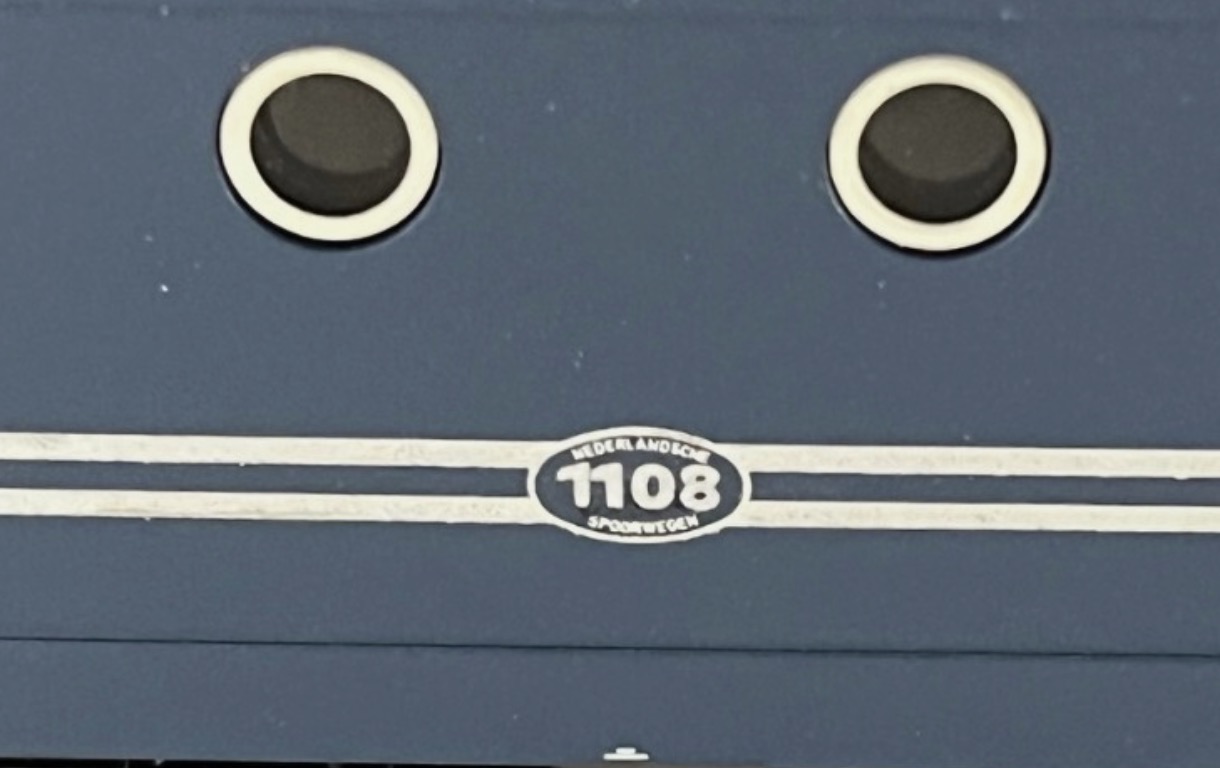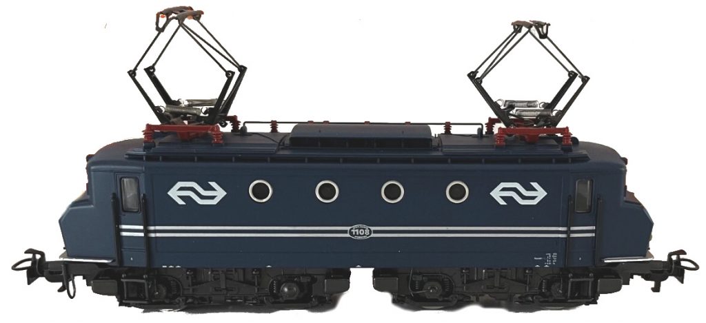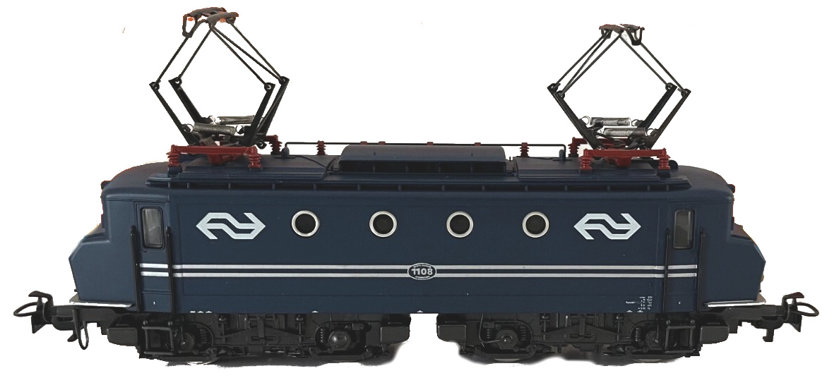 Modell der modernisierten Reihe 1100 der NS im alten Farbkleid, Aufbau Kunststoff, dunkelblau lackiert mit gelb schablonierten Vorbaustirnflächen, sonst wie 3324, seitliche Zierlinien und seitliche Betriebsnummer silberfarbig gedruckt, NS-Logos und übrige Aufschriften seitlich weiß, Betriebsnummer auf Stirnseiten schwarz gedruckt, Schleifschuh Typ 6.7.1, Kupplung Typ 8.3, Pantograph Typ 8.3.