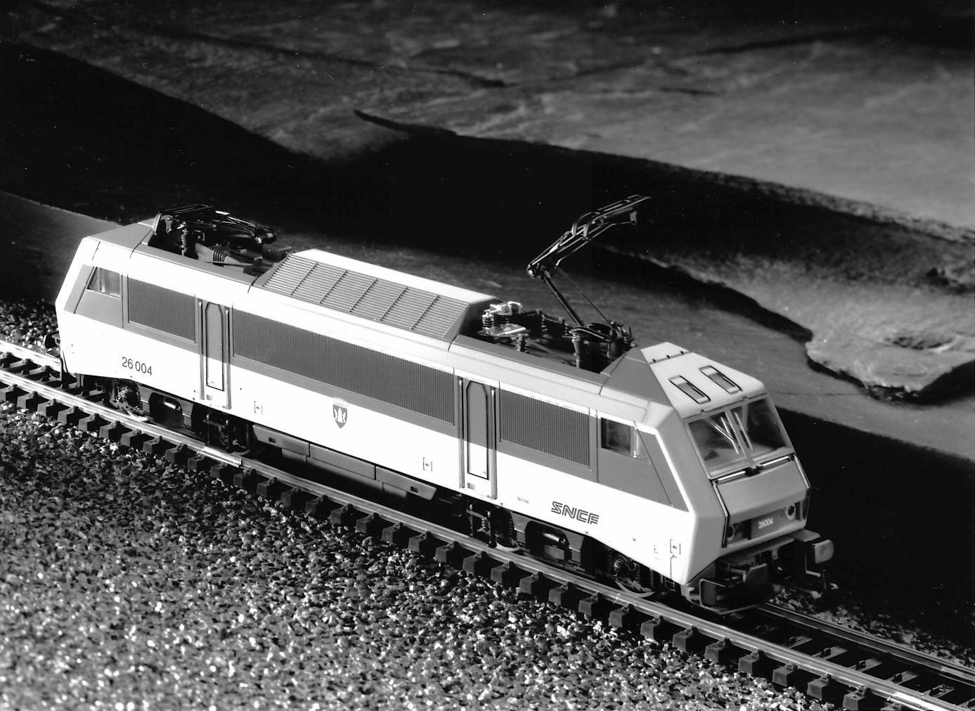 Modell der Serie BB 26000, System SYBlC (Zweisystem-Universallok) der Serie BB 26 000 der SNCF, für Regionalzüge bis 200 km/h und Güterzüge, Aufbau und Fahrgestell Zinkdruckguss, Fahrgestell ähnlich wie 3333 (Drehgestellblenden gedreht), Lackierung im Corail-Schema: Dach und Teil der Seitenwände basaltgrau (RAL 7012), Stirnwände und Dachlinie pastellorange (RAL 2003), übriger Aufbau achatgrau (RAL 7038) bzw. basaltgrau schabloniert lackiert, Betriebsnummer BB 26004, Wappen von Cernay seitlich aufgedruckt, Achsfolge B’B’, Schleifschuh Typ 6.7.1, Kupplung Typ 16.2, Bügel 1: Pantograph Typ 12.1 (Hauptschalterseite), Bügel 2: Pantograph Typ 12.3.