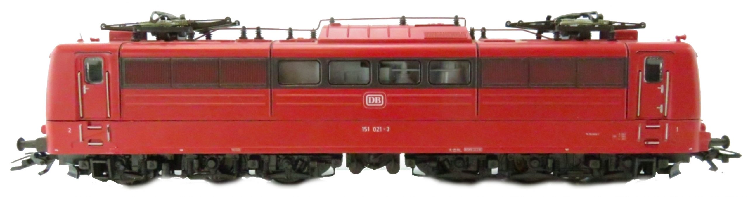Modell der BR 151 der DB, Aufbau Kunststoff komplett mit Dach im neuen Lackschema der DB orientrot (RAL 3031 ) lackiert, Linie der Lüfterblenden graubraun (RAL 8019) schabloniert, Unterbodengruppe grau braun lackiert, Drehgestellblenden aus Kunststoff graubraun durchgefärbt mit angesetzten Leitern zum Führerstand, Aufschriften weiß gedruckt, Betriebsnummer 151 021-3, Bw Nürnberg 2, Radsätze schwarz vernickelt, weitere Beschreibung siehe 3057, Achsfolge Bo’Bo’, Schleifschuh Typ 6.7.1, Kurzkupplung Typ 10.2.2, Pantograph Typ 8.4.1.