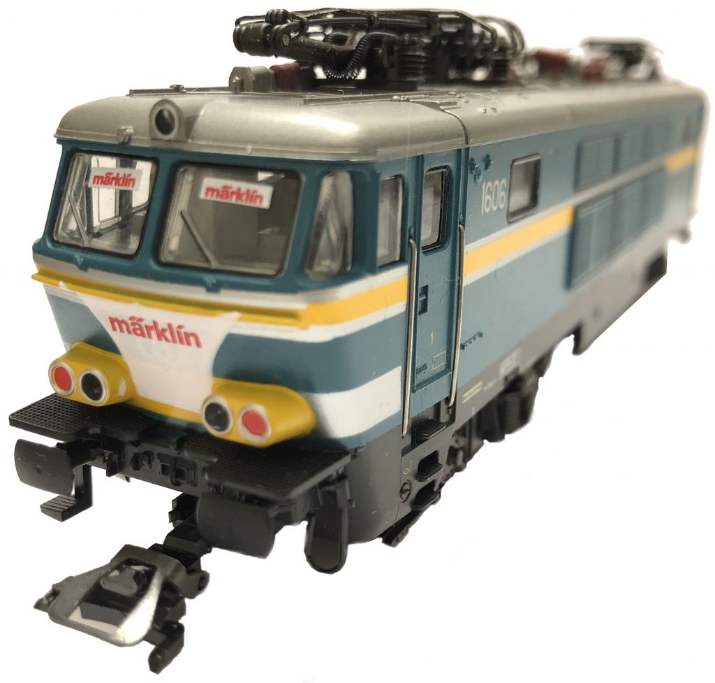 Modell einer Viersystemlokomotive, elektrischer Teil ACEC, Reihe 16 der SNCB, Aufbau ein Kunststoffteil, Dach silbergrau, gelb gedruckter Zierstreifen mit weißen Zierlinien begrenzt, sowie im Lampenbereich ein gelb schablonierter Warnlatz, schwarz schabloniert lackierte Schürze rundum höher als bei 3152, Betriebsnummer 1606, Depot Brüssel-Zuid (rechts), Bruxelles-Midi (auf linker Seite), Achsfolge Bo’Bo’, Schleifschuh Typ 6.7.1, Kupplung Typ 16.2, 1. Pantograph Typ 12.3, 2. Pantograph Typ 12.1, 3. Pantograph Typ 12.2.
