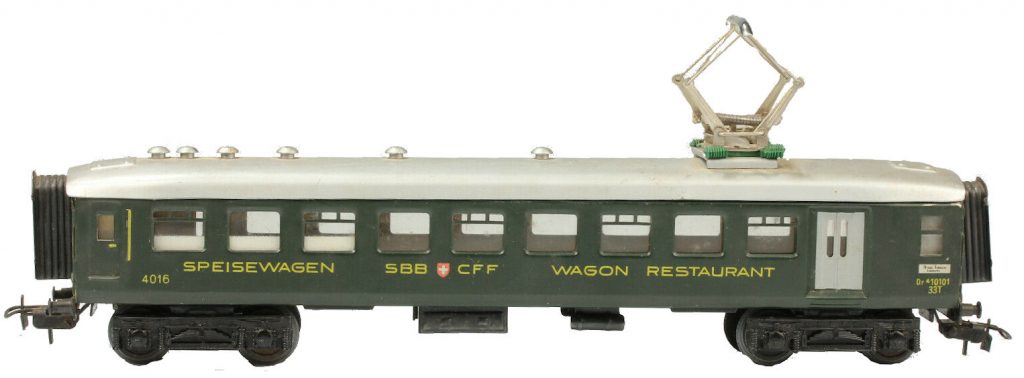 Modell der SBB, zwei zweiachsige Drehgestelle (wie bei 346/1 – 4006), Aufbau und Fahrgestell Blech, Dach abnehmbar, silberfarbig mit sechs eingesetzten Dachlüftern sowie einem Bügel, Aufbau dunkelgrün, Fahrgestell schwarz, Fenster mit Cellon hinterlegt, Aufschriften “SBB CFF” und “RESTAURANT” sowie Artikelnummer 348/2 und Kursschilder gedruckt.