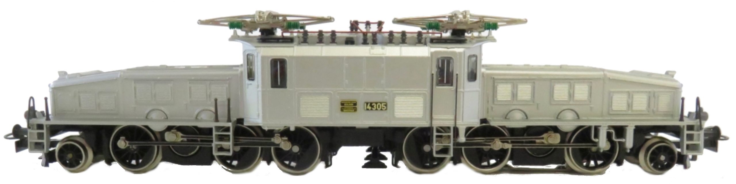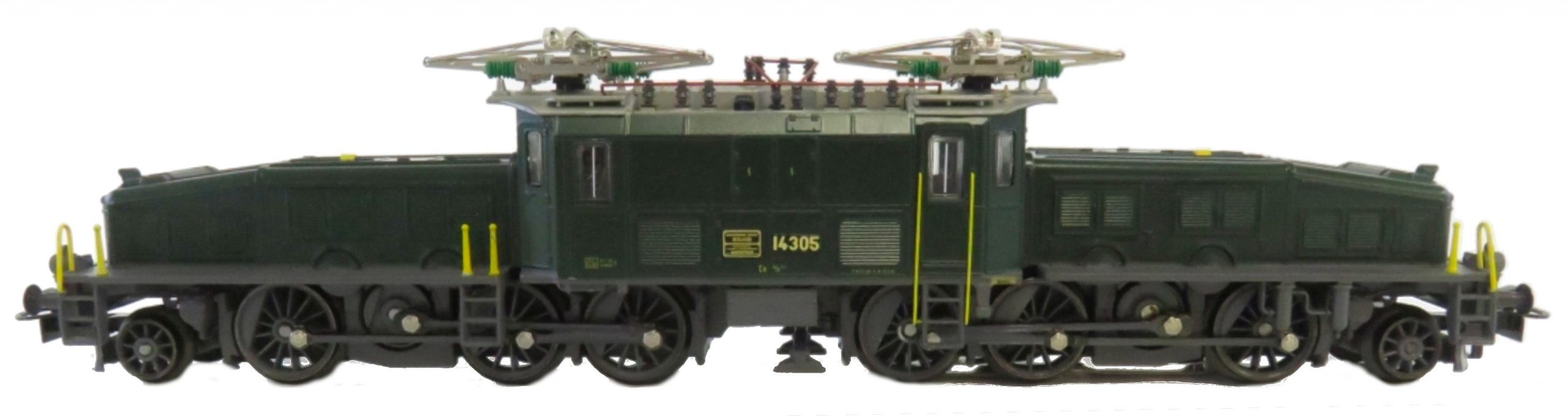 Modell der Serie Ce 6/8″ der SBB, baugleich mit 3352, Aufbau (Vorbauten und Mittelteil) Zinkdruckguss, flaschengrün (RAL 6007) lackiert, Dach silbergrau lackiert mit rotbraunen aufgesetzten Dachleitungen und aufgesetzten Dachstegen aus Kunststoff, Isolatoren grün, Fenster mit angedeuteten Scheibenwischern Kunststoff eingesetzt, Seitenfenster mit weißem Strich, beidseitig je drei Stirnlampen (Lichtleiter), keine angedeuteten Schlusslichter, Umschalter für Oberleitung oder Mittelleiter, Fahrgestelle und Rahmen Zinkdruckguss sowie Treibgestelle, Radsätze, Gestänge, Umlauf, Radsätze und Gestängeteile basaltgrau (RAL 7012), Betriebsnummer 14305, Depot Basel. Dreilicht-Spitzensignal und weißes Schlusslicht mit der Fahrtrichtung wechselnd (Lichtleiter, je Seite zwei Glühlampen 60 008, rote obere Schlußlampe imitiert, Achsfolge (1’C) (C’1), Schleifschuh Typ 6.7.1, Kupplung Typ 8.3, Pantograph Typ 16.1, Dachstromabnehmerlagerung im Isolatorbereich verbessert.