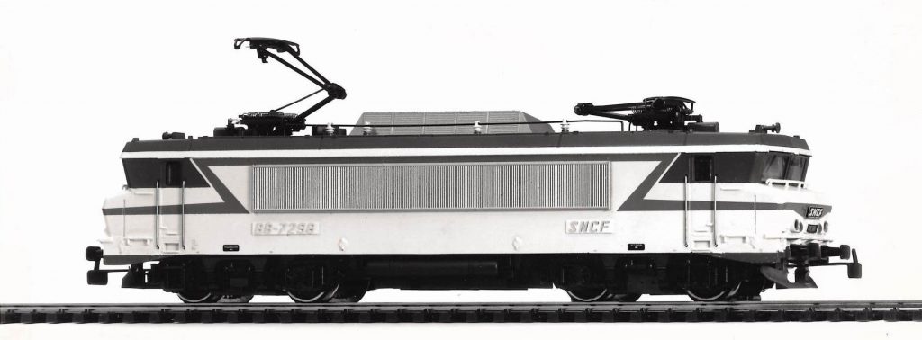 Modell der Serie BB 7200 der SNCF, Aufbau Zinkdruckguss, Gehäuse in hellerem achatgrau lackiert mit orangefarbig gedrucktem Zierstreifen, Dachleitung brüniert, mit weißen Isolatoren, Dach und Fensterpartie blaugrau, eingesetzter Dachaufbau und aufgesetzte Kunststoff-Lüfterblenden silberfarbig, Fahrgestell Zinkdruckguss, Unterflurattrappe (Hauptluftbehälter u. a.) und Drehgestellblenden Kunststoff graphitgrau durchgefärbt, Fenster Kunststoff eingesetzt, beidseitig je zwei Stirnlampen und zwei imitierte Schlussleuchten, Umschalthebel für Oberleitung / Mittelleiter, Betriebsnummer BB 7298 und Eigentumsbezeichnung SNCF auf erhabenen Schildern (Stirnseite schwarz), erhabene Beschriftung silberfarbig bedruckt, Depot Villeneuve, Achsfolge B’B’ (monomoteur), mit „schnellem Getriebe”, Achsen des hinteren Drehgestelles durch Stirnräder angetrieben, Schienenräumer, Räder mit Haftreifen, vorderes Drehgestell (Blech brüniert) ohne eigenen Antrieb, Vollräder vernickelt, Radkörper schwarz lackiert, Schleifschuh Typ 6.7.1, Kupplung Typ 16.2, Pantograph Typ 9.2.