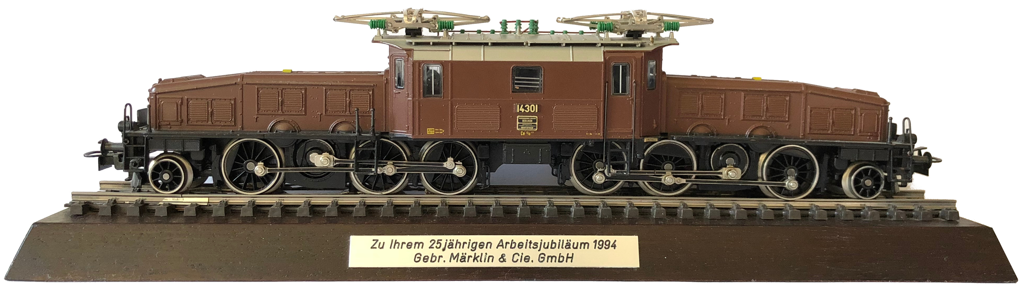 Modell der Serie Ce 6/8 lll, zweite „Krokodil”-Generation (mit Winterthurer Schrägstangenantrieb) der SBB, Aufbau (Vorbauten und Mittelteil) Zinkdruckguss, nußbraun (RAL 8011), Umläufe schwarz halbmatt, Dach silbergrau lackiert mit rotbraunen aufgesetzten Dachleitungen und aufgesetzten Dachstegen aus Kunststoff, Isolatoren grün, Fenster mit angedeuteten Scheibenwischern Kunststoff eingesetzt, Seitenfenster mit weißem Strich, beidseitig je drei Stirnlampen (Lichtleiter), keine angedeuteten Schlusslichter, Umschalter für Oberleitung oder Mittelleiter, Fahrgestelle und Brücke Zinkdruckguss schwarz lackiert, eingesteckte Fahrwerksverkleidungen (gegenüber 3056 verbesserte sogenannte „Attrappen”), aufgesetzte Pufferbohlen und Laufgestelle Kunststoff schwarz durchgefärbt, Aufschriften gelb gedruckt, Fabrikschilder und Betriebsnummer 14301 schwarz bedruckte Messingfolie auf erhabene Schilder aufgeklebt, Depot Erstfeld, Achsfolge (1’C) (C’1), Achsen eines Triebwerkteils durch Stirnräder angetrieben, A- und C- Radsatz mit Haftreifen, zweites Triebwerk ohne eigenen Antrieb, Speichenräder, Radkörper (Gegengewichte größer als bei 3056) schwarz lackiert, Treib- und Kupplungsstangen (einteiliges Zinkdruckgussteil, gegenüber 3056 besser profiliert, Befestigung jetzt mit kleineren Sechskantschrauben – Seitenmaß 2,5 mm, 3056 = 3,0 mm) schwarz ausgelegt, Digitaldecoder (Motorola Märklin Format).