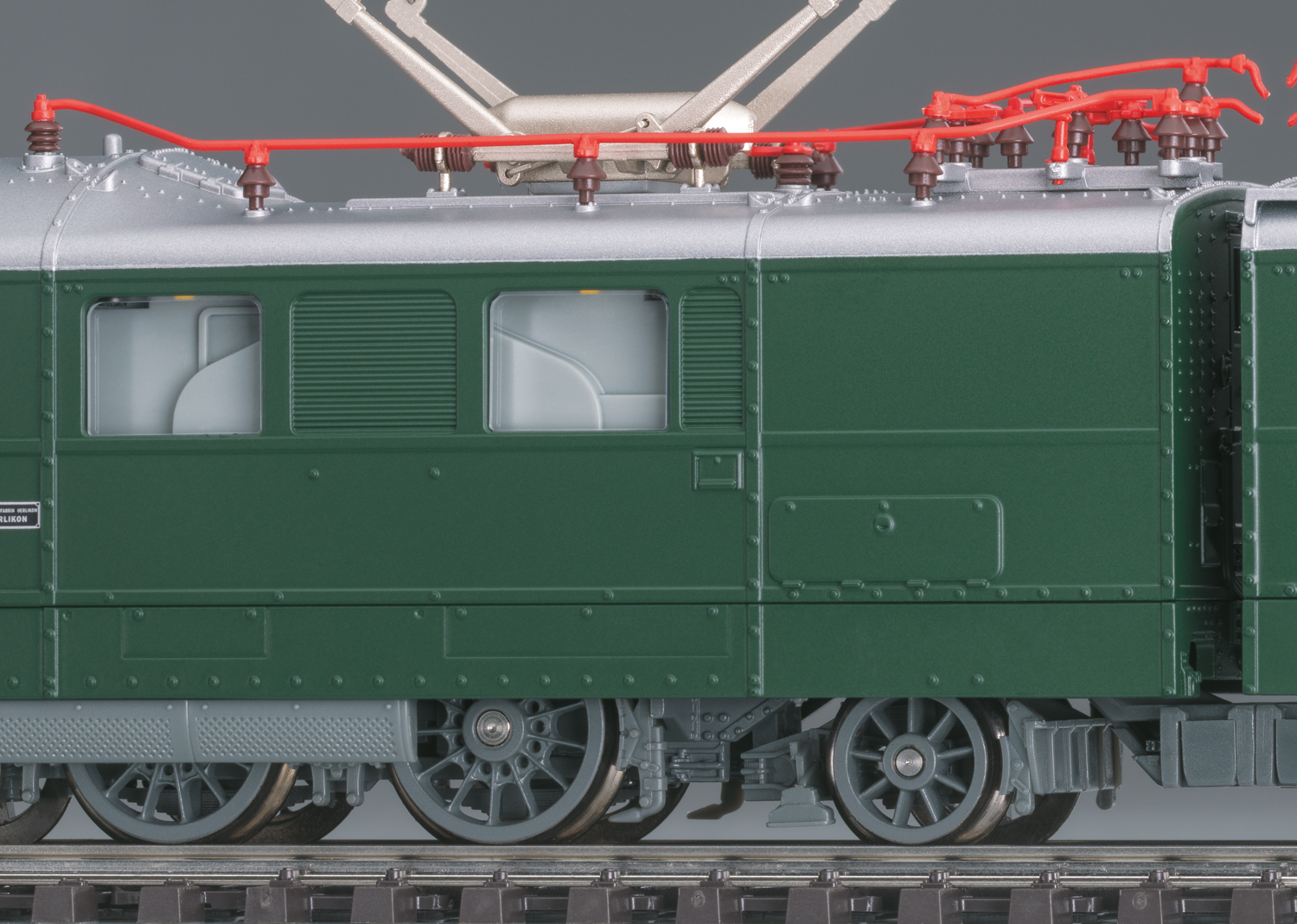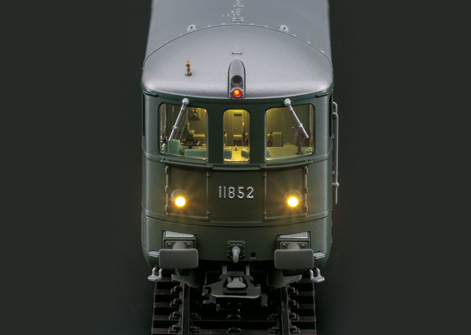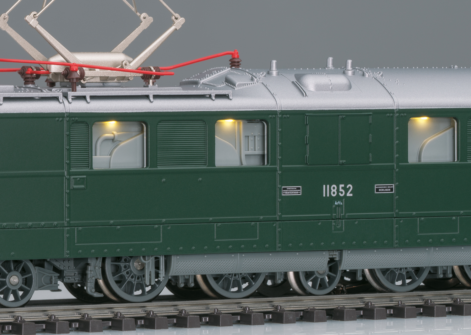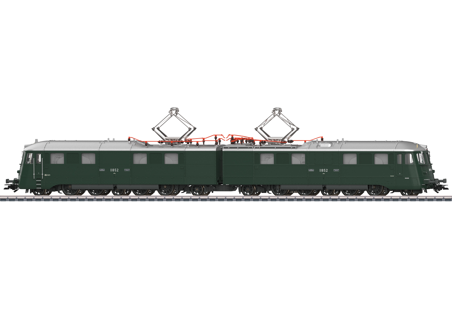Vorbild: Schwere Doppel-Elektrolokomotive Ae 8/14 “Landilok” der Schweizerischen Bundesbahnen (SBB). Dunkelgrüne Grundfarbgebung. Ausführung mit 2 Pantographen. Hülsenpuffer mit eckigen Puffertellern. Lok-Betriebsnummer 11852. Betriebszustand Anfang der 1970er Jahre.