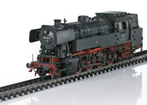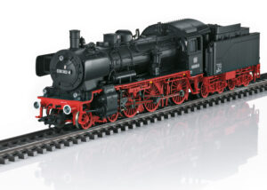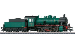 Modell: Mit Digital-Decoder mfx+ und umfangreichen Licht- und Soundfunktionen. Geregelter Hochleistungsantrieb mit Schwungmasse im Kessel. Drei Achsen angetrieben. Haftreifen. Lokomotive und Tender weitgehend aus Metall. Serienmäßig eingebauter Raucheinsatz, mit geschwindigkeitsabhängigem, dynamischem Rauchausstoß, digital schaltbar. Fahrtrichtungsabhängig wechselndes Zweilicht-Spitzensignal an Lok und eine Lampe an der Tenderrückseite konventionell in Betrieb, digital schaltbar. Lampe an der Tenderrückseite kann auf rotes Licht umgeschaltet werden. Drittes Spitzenlicht an der Lokfront als elektrische Lampe separat zu- und auf rote Beleuchtung umschaltbar. Führerstandsbeleuchtung und Feuerbüchsenflackern digital schaltbar. Beleuchtung des Tender-Durchgangs digital schaltbar. Beleuchtung mit wartungsfreien warmweißen und roten Leuchtdioden (LED). Verstellbare Kurzkupplung mit Kinematik zwischen Lok und Tender. Am Tender kinematikgeführte Kurzkupplung mit NEM-Schacht. Pufferhöhe an Lok und Tender nach NEM. Bremsschläuche, Schraubenkupplungsimitationen und geschlossene Zylinderdeckel liegen bei. Länge über Puffer circa 24,5 cm.
