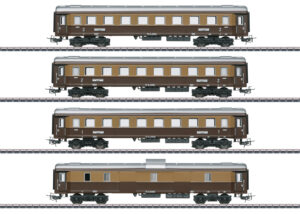 Vorbild: 4 vierachsige TEE-Reisezugwagen unterschiedlicher Bauarten der Deutschen Bundesbahn (DB). Kobaltblau/beige Rheingold-Farbgebung. 1 TEE-Großraumwagen Ap4üm-62, 1. Klasse. 1 TEE-Speisewagen WR4üm-64, 1. Klasse. 1 TEE-Aussichtswagen AD4üm-62, 1. Klasse. 1 TEE-Abteilwagen Av4üm-62, 1. Klasse. Betriebszustand um 1962.