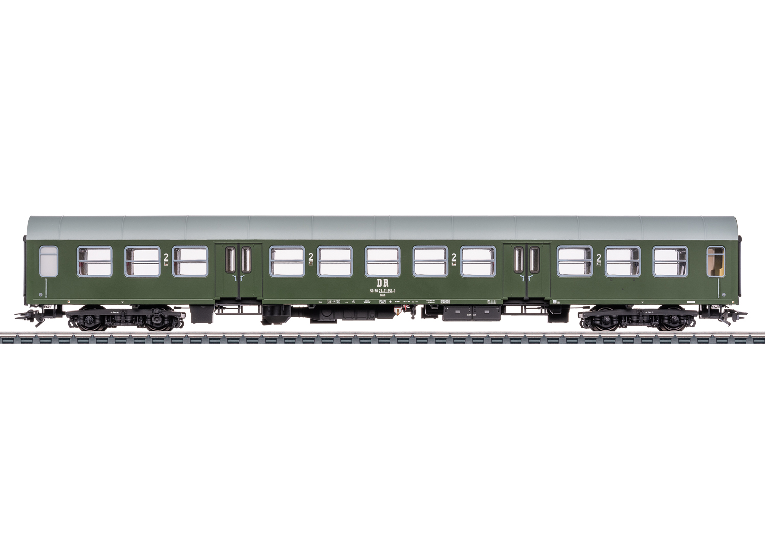 Vorbild: Personenwagen Bauart Bmh, 2. Klasse, der Deutschen Reichsbahn (DR/DDR). Bauart “Halberstädter Mitteleinstiegswagen” in dunkelgrüner (TGL 2233) Grundfarbgebung. Betriebszustand Ende der 1980er-Jahre.
