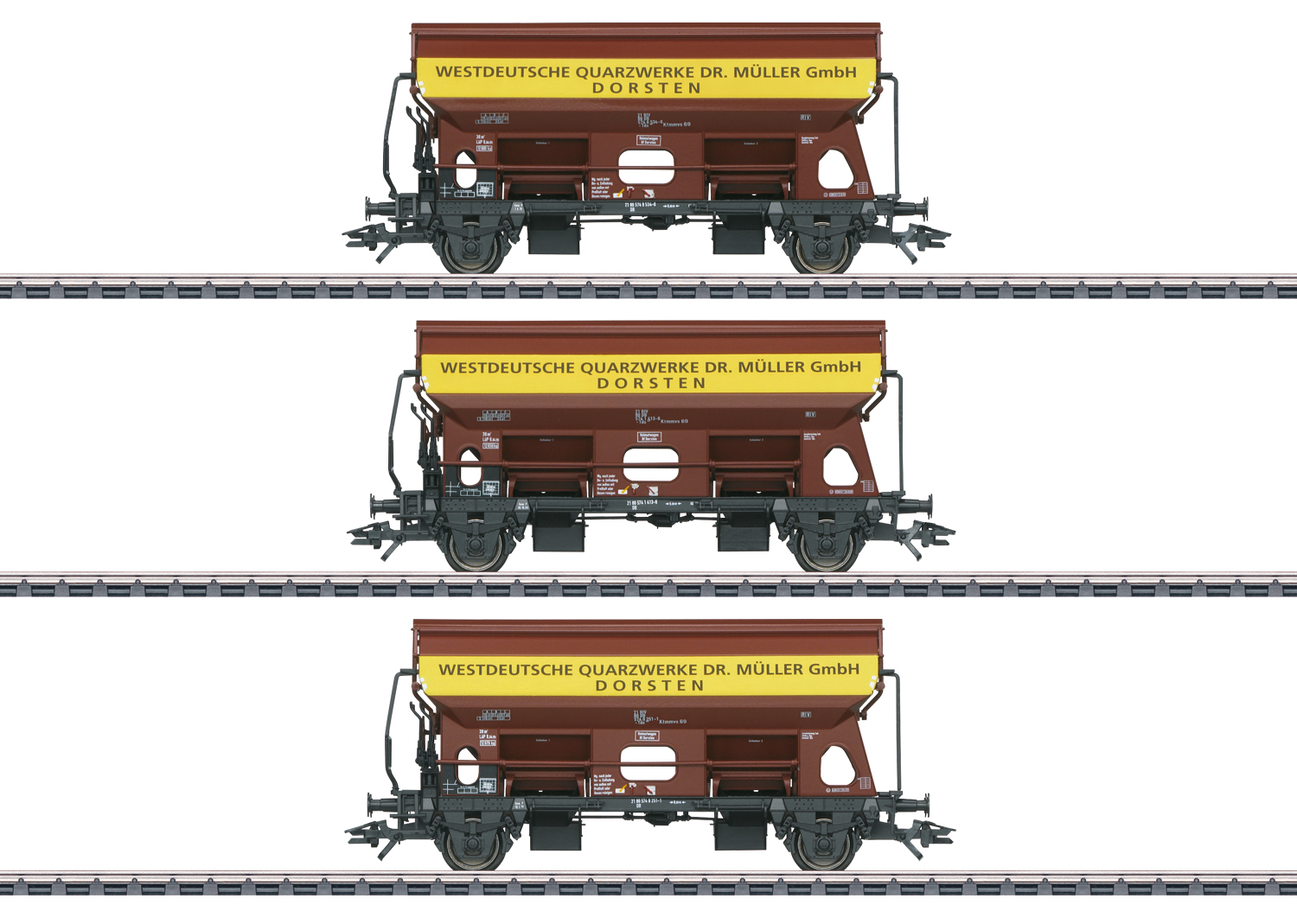 Vorbild: Drei Selbstentladewagen mit Schwenkdach Tds 930 der Deutschen Bundesbahn (DB) in rotbrauner Farbgebung mit Werbeaufschrift „Westdeutsche Quarzwerke Dr. Müller“. Betriebszustand ab 1970.
