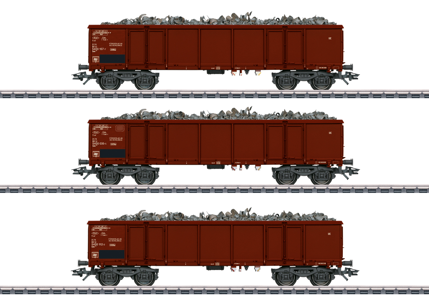 Vorbild: Drei offene Hochbordwagen Bauart Eaos der Statens Järnvägar (SJ), registriert in Schweden, vermietet von der DB. Rotbraune Grundfarbgebung. Betriebszustand ab 1993.