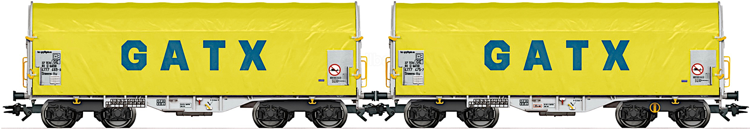 Vorbild: Zwei kurze, vierachsige Schiebeplanenwagen Bauart Shimmns der GATX Rail Europe. Gelbe Grundfarbgebung mit grauen Stirnwänden. Aktueller Betriebszustand.