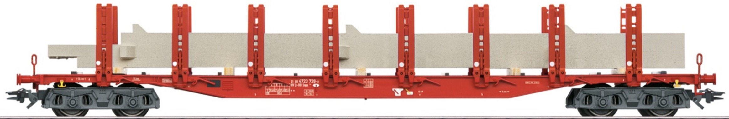 Vorbild: 4-achsiger Doppelrungenwagen Bauart Snps 719 der Deutschen Bahn AG (DB AG). Beladen mit einer Stütze der Fa. Max Bögl.