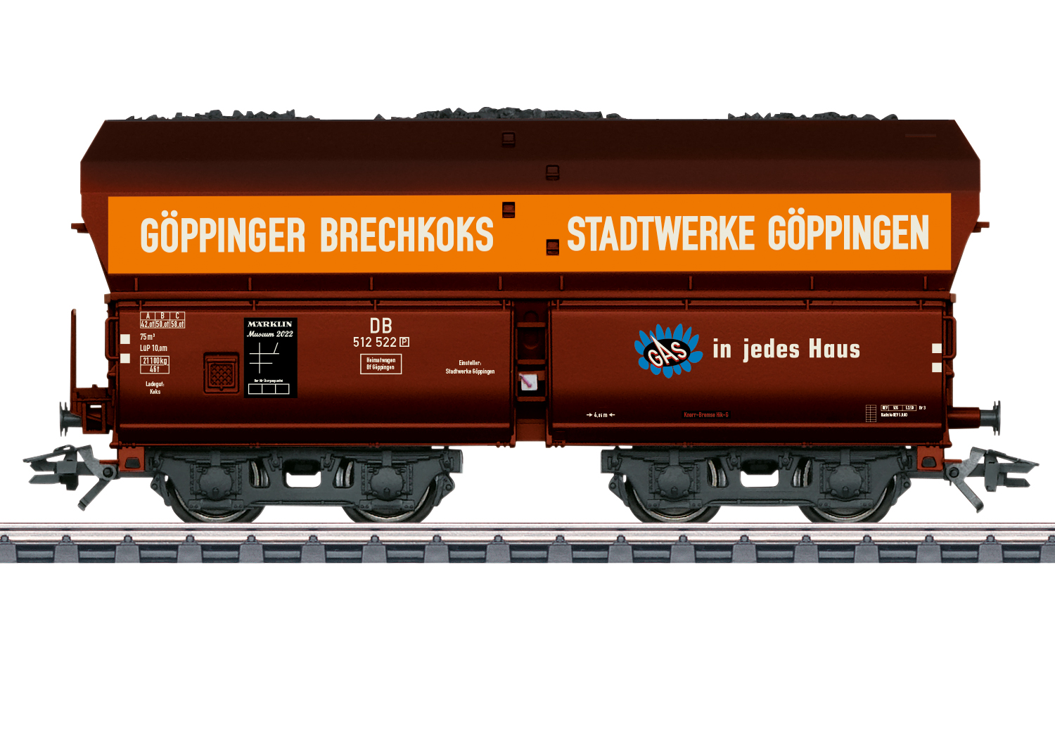 Vorbild: Vierachsiger offener Selbstentladewagen der Bauart OOtz41. Mit hohem Oberkasten und geschweißten Pressblech-Drehgestellen der Einheitsbauart. Rotbraune Grundfarbgebung mit längsseitiger Werbebeschriftung. Privatwagen der Stadtwerke Göppingen (SWG), eingestellt bei der Deutschen Bundesbahn (DB). VW-Bus T1 mit Gepäckträger der Stadtwerke Göppingen. Betriebszustand um 1959.
