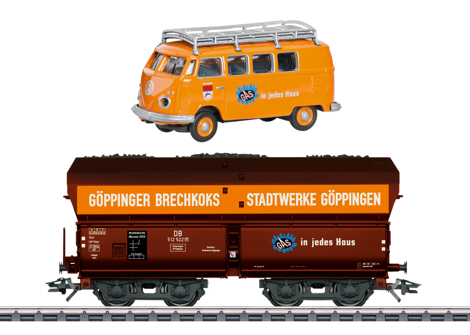 Modell: Selbstentladewagen in detaillierter Ausführung, mit Bremserbühne und stirnseitigem Stellrad. Mit Ladegut-Einsatz und echter Kohle in maßstäblicher Körnung beladen. Schuco-Modell eines VW-Bus T1 mit Gepäckträger liegt bei. Gleichstromradsatz E700580. Attraktive Verpackung in einer Metall-Dose.
