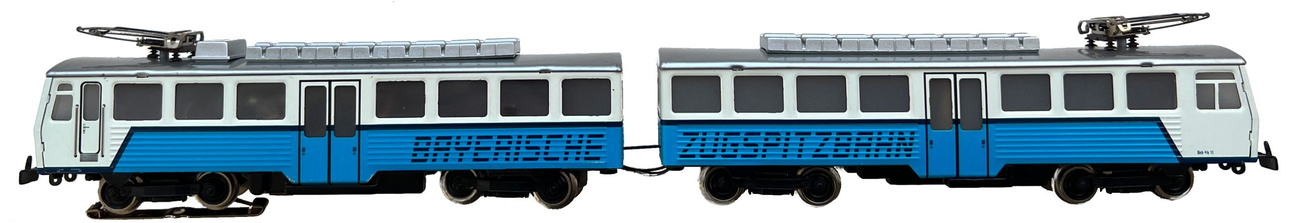 Modell vom Schienenbus „Bayerische Zugspitzbahn”, Aufbau und Dach Feinblech geprägt, Dach mit Bremswiderstandsattrappen silberfarbig lackiert, Seitenwände im unteren Bereich gesickt, weiß / blau lithografiert, Aufschrift BAYERlSCHE ZUGSPlTZBAHN und Zierlinie enzianblau, Stirnseiten mit bayrischem Wappen, Fenster mit Cellon hinterlegt, Fahrgestell aus Metall schwarz, Drei-Lichtspitzensignal und Schlußsignal (LEDs) fahrtrichtungsabhängig geschaltet. mit Unterflurattrappen aus Zinkdruckguss, Antriebsteile und Drehgestelle von Märklin 3028, Achsfolge 2’B’+2’2′, vier Haftreifen, Schleifer Typ 6.7.1, Kupplung Typ 16.2, Pantograph Typ 12.9.