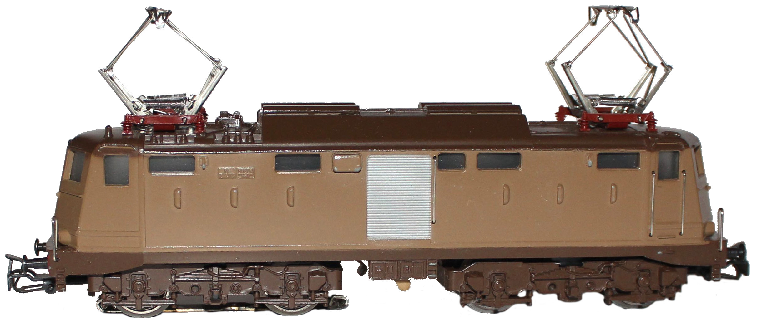 Modell der Baureihe 424 der FS, Aufbau Zinkdruckguss, Dach, Brückenrahmen und Kunststoff-Drehgestelle matt, übriger Aufbau hellbraun lackiert (Farbton während der langen Fabrikationszeit variierend), auf jeder Stirnseite zwei Lampen, Betriebsnummer E 424103, Fahrgestell brüniertes Blech, Motor mit Flachkollektor, Achsfolge Bo’Bo’, Achsen des hinteren Drehgestells durch Stirnräder angetrieben, beide Radsätze mit Haftreifen, vorderes Drehgestell ohne eigenen Antrieb, Radkörper Speichenräder vernickelt, nicht lackiert, Pufferbohle rot mit erhabener Betriebsnummer E 424 103, Umschalthebel für Oberleitung oder Mittelleiter, Kupplungen Typ 19.1, zwei Pantograph Typ 8.1, HAMO 2L=.