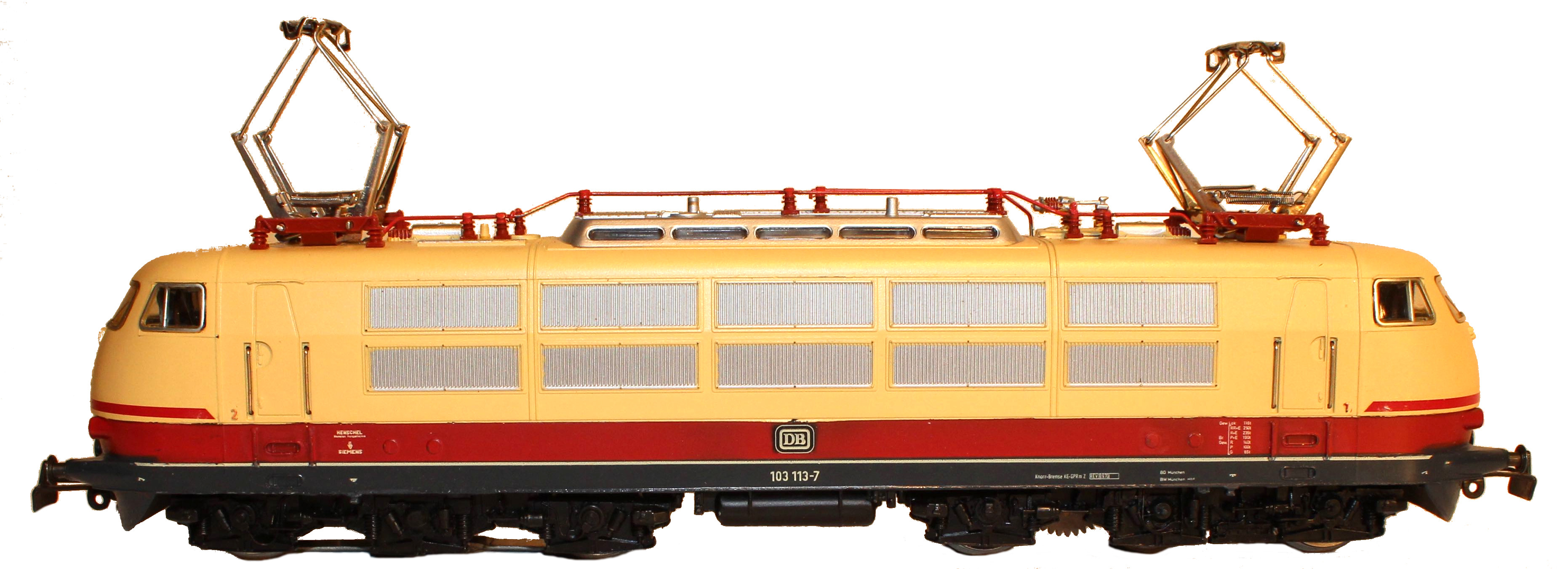 Modell der BR 103 der DB, Aufbau Kunststoff elfenbeinbeige halbmatt lackiert mit je einem roten Zierstreifen auf den Stirnseiten mit geraden Enden, je zwei silberfarbig schablonierten Lüfterblenden-Reihen beidseitig, Brückenrahmen Zinkdruckguss, Drehgestellblenden Kunststoff schwarz durchgefärbt, karminrot / dunkelgrau lackiert, Dach mit aufgesetzten rotbraunen Dachleitungen und silberfarbigen Dachsegmenten, Aufschriften weiß gedruckt, DB-Emblem auf schwarzem Grund und Betriebsnummer 103 113-7, auf den Stirnseiten erhabene Schilder (Lokschild rot) gedruckt, Fabrik-, Brems-, BD- und Bw-Schilder, Untersuchungsdatum 22.4.65, Lokseiten-Kennzeichnung erhaben, rot, Fenster Kunststoff mit silberfarbigen Rahmen, je drei Stirnlampen (Lichtleiter), Umschalthebel für Oberleitung oder Mittelleiter, Achsfolge Co’ Co’, Drehgestellblenden Kunststoff schwarz durchgefärbt, Achsen des hinteren Drehgestells durch Stirnräder angetrieben, A- und C-Radsatz mit Haftreifen, Radkörper Vollräder schwarz lackiert, Kupplungen Typ 16.2, Pantograph Typ 8.1, HAMO 2 L=.