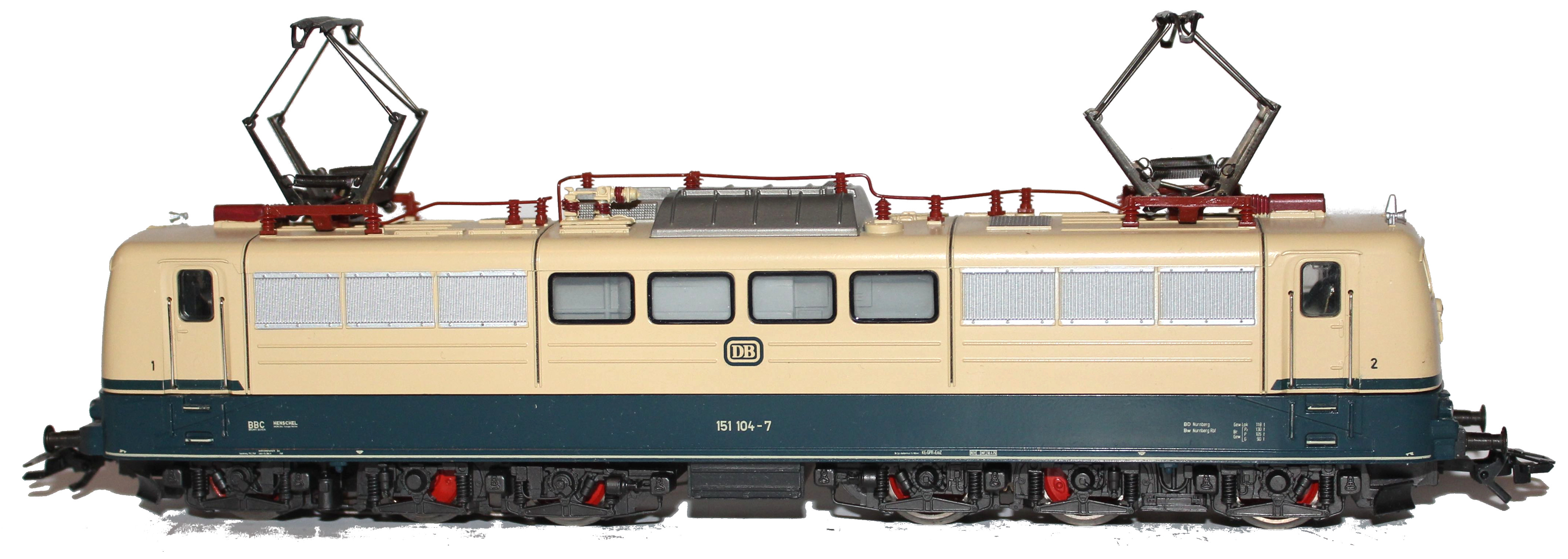Elektrische Lokomotive, BR 151 der DB, Achsfolge Co’Co’. Dach mit aufgesetzten rotbraunen Dachleitungen, Trafoabdeckung grausilber, Lüfterblenden auf Dach und seitlich silberfarbig schabloniert. Aufbau elfenbeinbeige halbmatt lackiert. Stirnseiten mit schräg endendem, ozeanblau gedrucktem Zierstreifen. Aufbau gesamt Kunststoff. Brückenrahmen Zinkdruckguss ozeanblau halbmatt lackiert. Drehgestellblenden Kunststoff, dunkelgrau lackiert, je drei Stirnlampen (Lichtleiter) und zwei angedeutete Schlussleuchten, Umschalthebel für Oberleitung oder Mittelleiter, Aufschriften weiß und oceanblau gedruckt, Betriebsnummer 151 104-7, Achsfolge Co’ Co’, A- und C-Radsatz mit Haftreifen, Kupplungen Typ 17.1, Pantograph Typ 8.2, Hamo, 2L=.