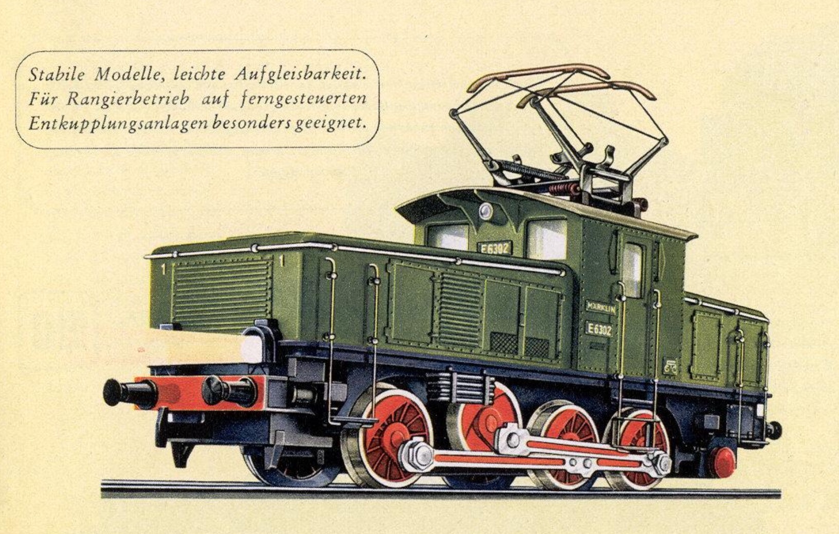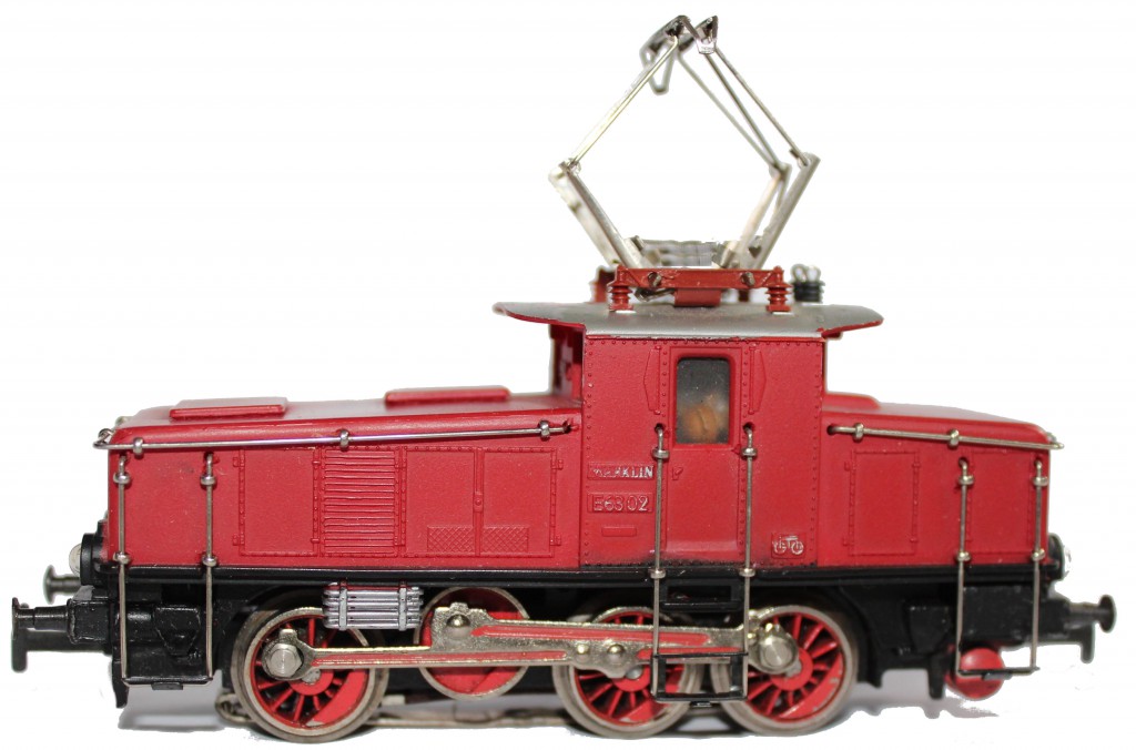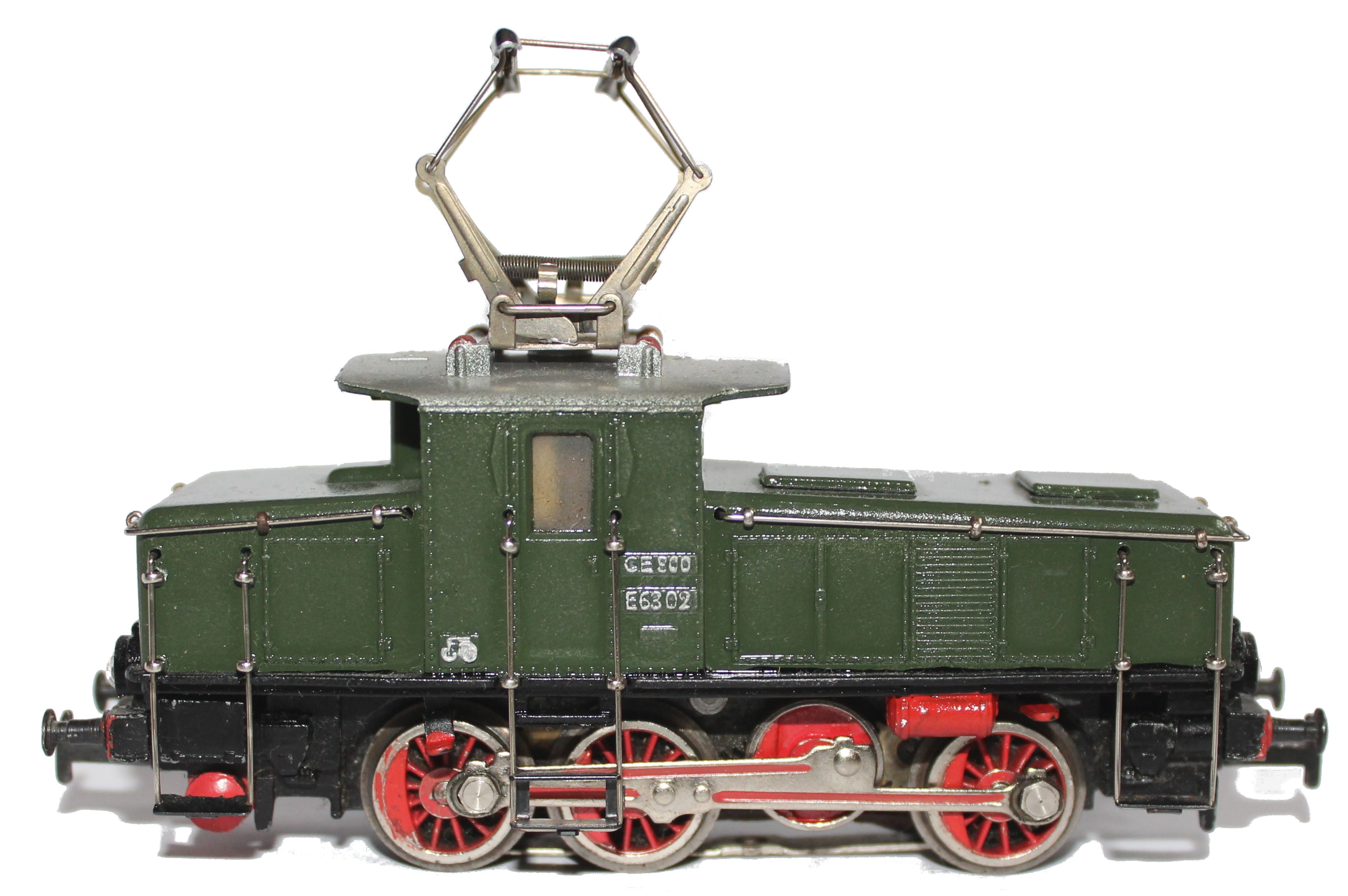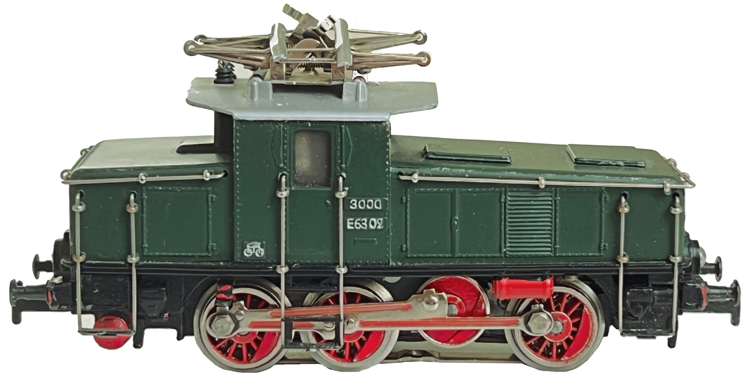 Modell der BR E 63 (Typ AEG) der DB, Aufbau Kunststoff, Fahrgestell Zinkdruckguss dunkelgrün lackiert, Dach silberfarbig, alle Aufschriften beidseitig silberfarbig hervorgehoben, Artikelnummer CE 800 und Betriebsnummer E 63 02 auf rechter Führerhausseitenwand, links Märklin, je zwei Stirnlampen, rechts vorn zusätzlicher Handschalthebel für Fahrtrichtungsumschaltung, Achsfolge C, alle Achsen durch Stirnräder angetrieben, C-Achse mit Haftreifen, Radkörper und Stangen rot ausgelegt, Umschalthebel für Oberleitung oder Mittelleiter, Schleifschuh Typ 6.2, Schleifschuh Typ 6.5 oder Schleifschuh Typ 6.8 (je nach Baujahr), Kupplungen Typ 15.2, Pantograph Typ 7.1.