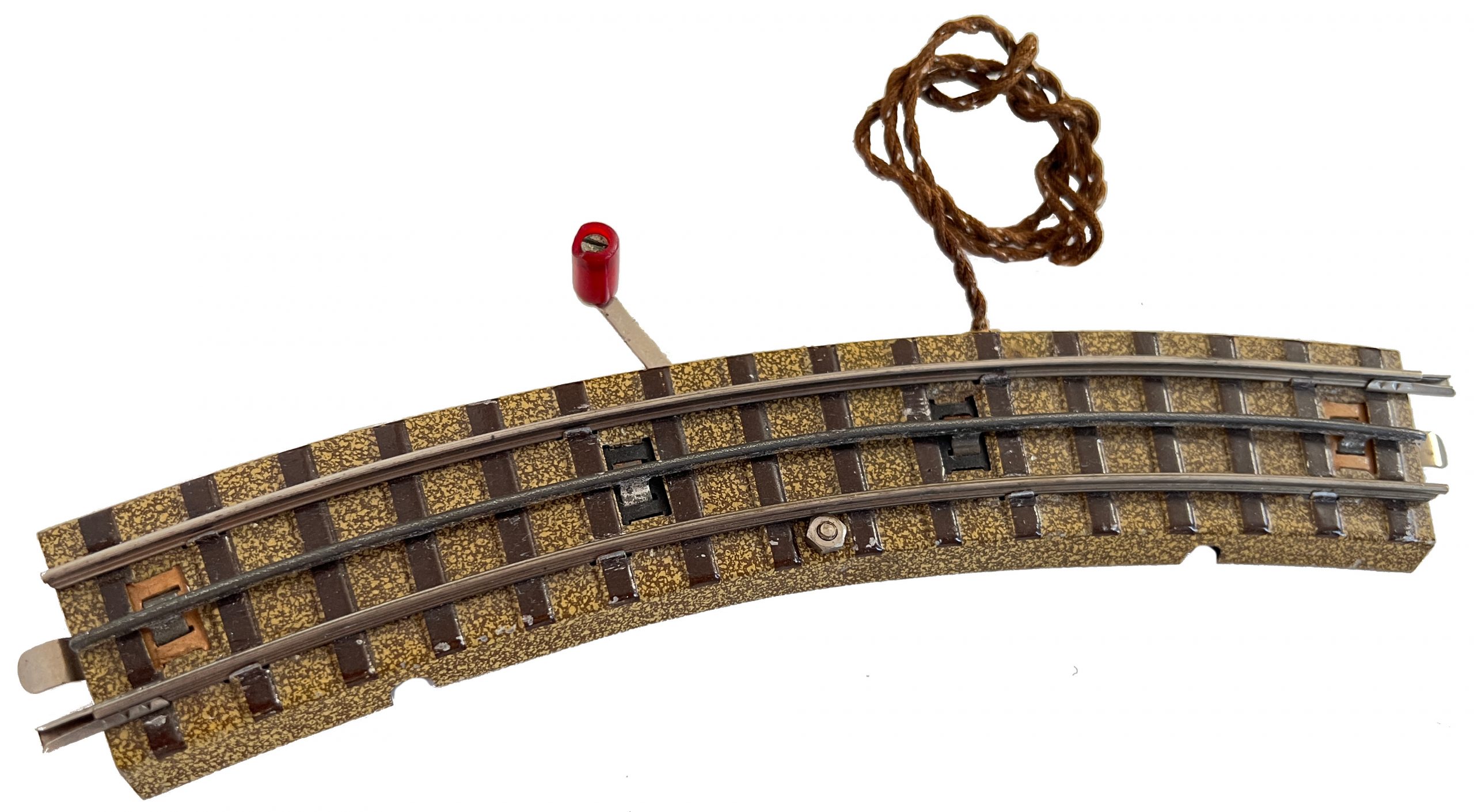 Vollprofilschienen, Oberseite cremig hellbeige gesprenkelt, ohne Befestigungslöcher, Unterseite braunbeige mit schwarzem Stempel „Märklin Germany“. Schienenprofil vernickelt, Mittelleiter 2 mm Stärke, Böschung mit doppelter Aussparung für die Kabeldurchführung, schmale Verbindungslaschen vernickelt. Außen 2 beige und innen 2 schwarze Papp-Isolierlaschen. Stellhebel seitlich, dunkelroter geschraubter Handhebel, Stellkontakte unten durch braunes Blech geschützt, Stellhebel im Bereich der Widerstandsdrahtwicklung glatt.