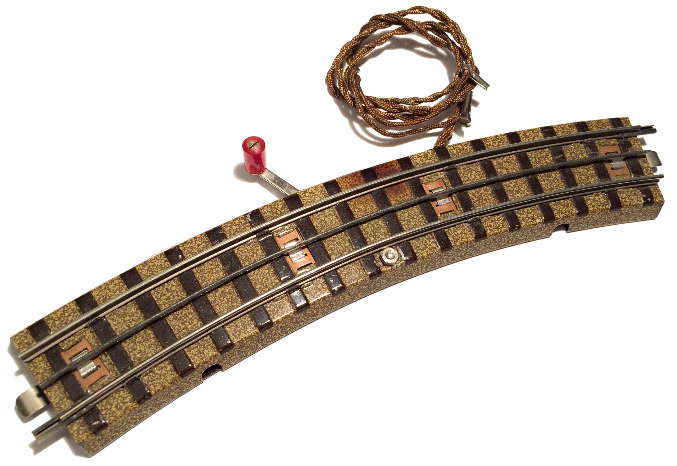 Vollprofilschienen, Oberseite cremig hellbeige gesprenkelt, ohne Befestigungslöcher, Unterseite braunbeige mit schwarzem Stempel „Märklin Germany“. Schienenprofil vernickelt, Mittelleiter 1 mm Stärke, Böschung mit doppelter Aussparung für die Kabeldurchführung, schmale Verbindungslaschen vernickelt. Stellhebel seitlich aus der Böschung herausragend, dunkelroter genieteter Handhebel, Gegenseite verschraubt. Stellkontakte unten durch braunes Blech geschützt. Stellhebel im Bereich der Widerstandsdrahtwicklung gepresst.