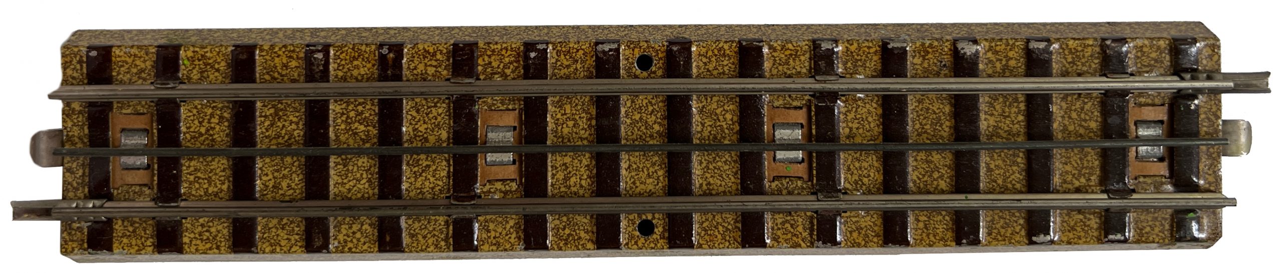 Vollprofilschienen, Gleiskörper: Oberseite rosabeige ohne Maserung, Unterseite lila, kein Stempel (vermutlich für den deutschen Markt). Schienenprofil brüniert, Mittelleiter 2 mm Stärke, Böschung mit Aussparung für die Kabeldurchführung, schmale Verbindungslaschen aus rohem Blech, 4 schwarze Papp-Isolierlaschen, zwei versetzte Befestigungslöcher zwischen 4. und 5. Schwelle.