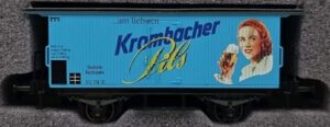 Wagen hellblau, Aufschrift "...am liebsten Krombacher Pils", farbige Abbildung Dame mit Bierglas, Verpackung: Blechdose mit Abbildung Oldtimer Bier-LKW vor Brauerei ...