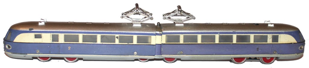 Modell ohne Vorbild, Gehäuseteile Zinkdruckguss, zweiteilig, ein Teil mit Motor ausgestattet, Faltenbalg (Turm) und Laufgestelle aus Blech, Gehäuse, Schürze und Unterseite mit Firnislack überzogen, dadurch bei einigen Exemplaren Dachverfärbung von silberfarbig bis goldfarbig, im Bereich violettelfenbein auch bräunliche Verfärbungen, Stirnlampen aus Kunststofflinsen, deren weiße bzw. rote Beleuchtung mit der Fahrtrichtung wechselt, Lichtwechsel wird durch zwei zusätzliche Kontaktlaschen am Umschaltrelais gesteuert, Triebwagen durch Stift am Turmdrehgestell und Leitungen mittels Steckkontakt am Turm trennbar, Innenbeleuchtung, Fahrtrichtungsumschalter ragt aus dem Dach des Motor-Teils beim Pantograph Typ 2.2 oder Pantograph Typ 2.3 heraus, Dachaufbau 10 x 18 mm, Handumschalter für Oberleitung oder Mittelleiter, zwei Schleifschuhe Typ 2.1.1, Gehäuseaufbau violett / elfenbein, Schürze hellgrau lackiert, Achsfolge B 2 B.