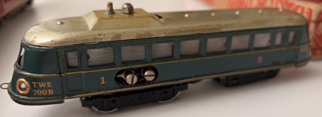 TWE700 blau. Motor alter Eigenbau aus Messing, Umschalter fehlt, ebenso das Blech zur Verbindung Motor/Dach. Mit wenig Aufwand wir da ein hübsches Stück draus! 1300 Euro